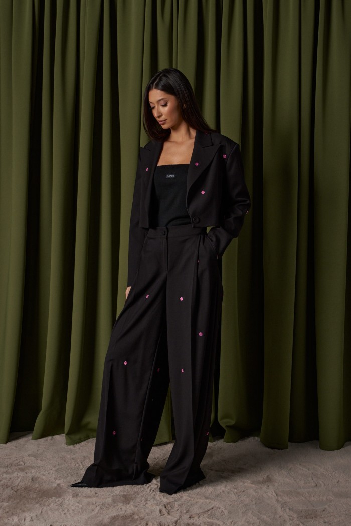 Брюки-палаццо свободного кроя выполнены из костюмной ткани черного цвета с цветочной вышивкой. Характеристики: стабильный пояс без шлевок, в боковых швах карманы с отрезным бочком, по переду застежка молния и пуговица. Длина 112 см.