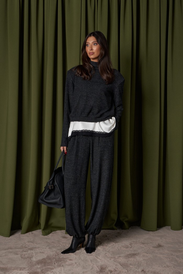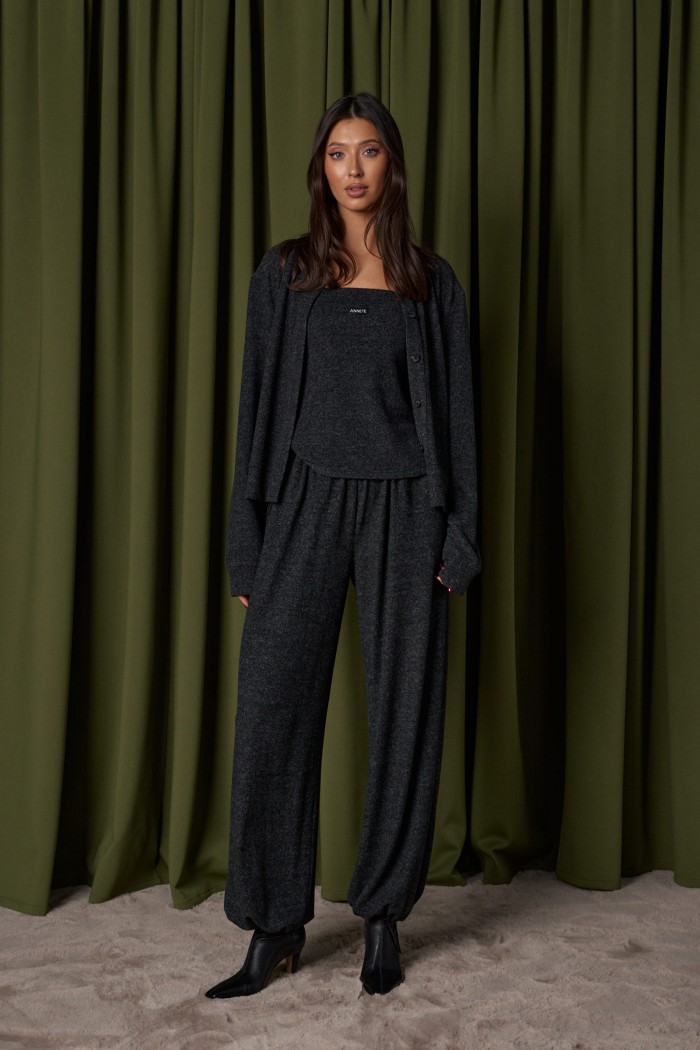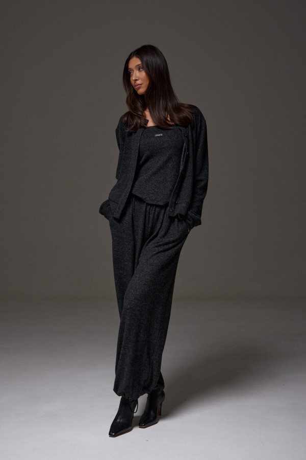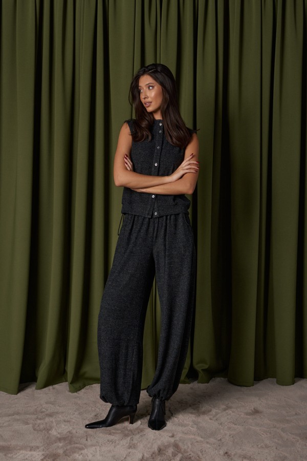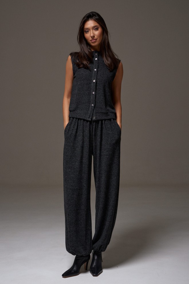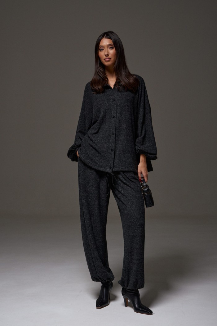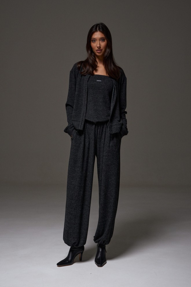 Брюки-джоггеры. Выполнены из мягкого ворсистого трикотажного полотна темно-серого цвета. Характеристики: прямой крой, пояс на шнурке-резинке с фиксатором, в боковых швах карманы, штанина внизу на резинке с фиксатором. Длина 103см.