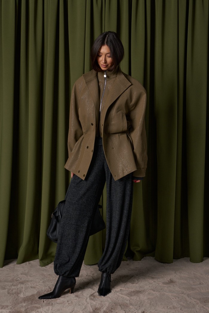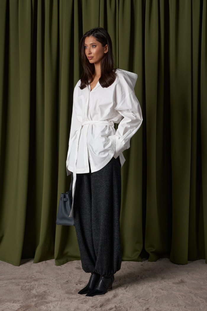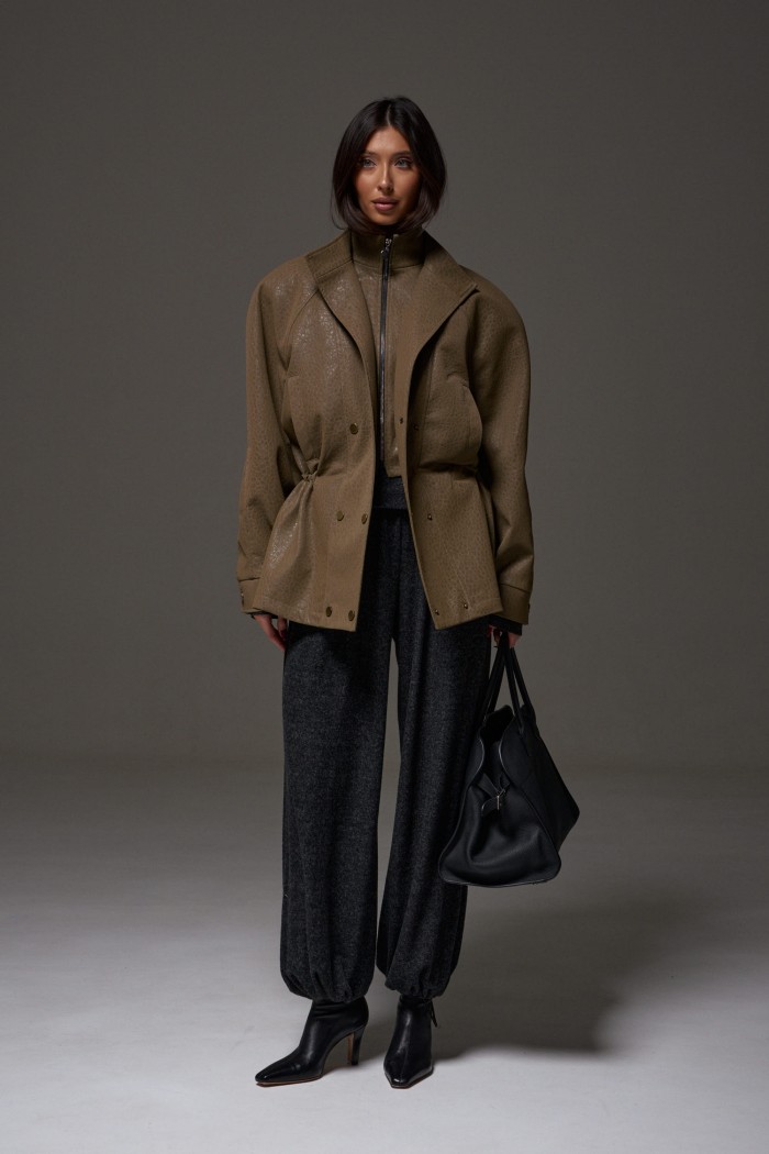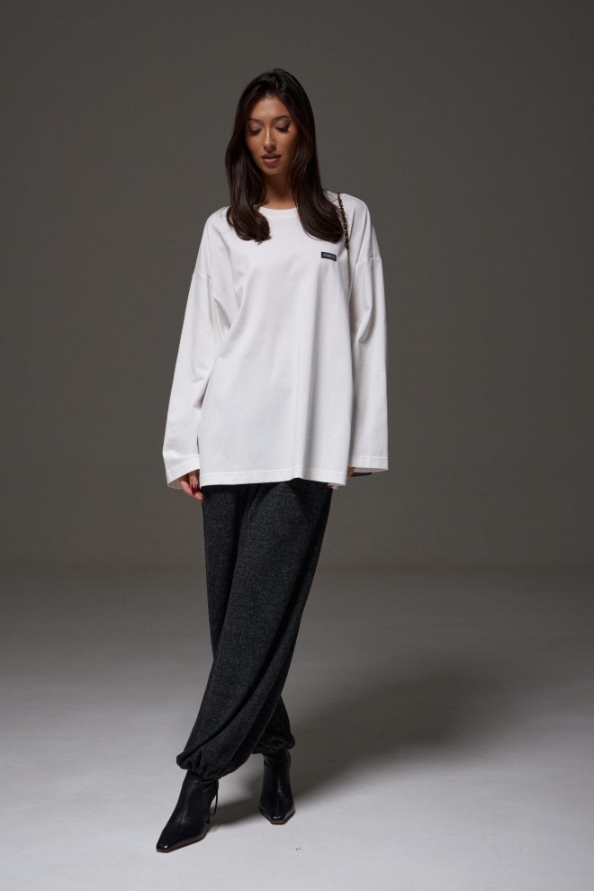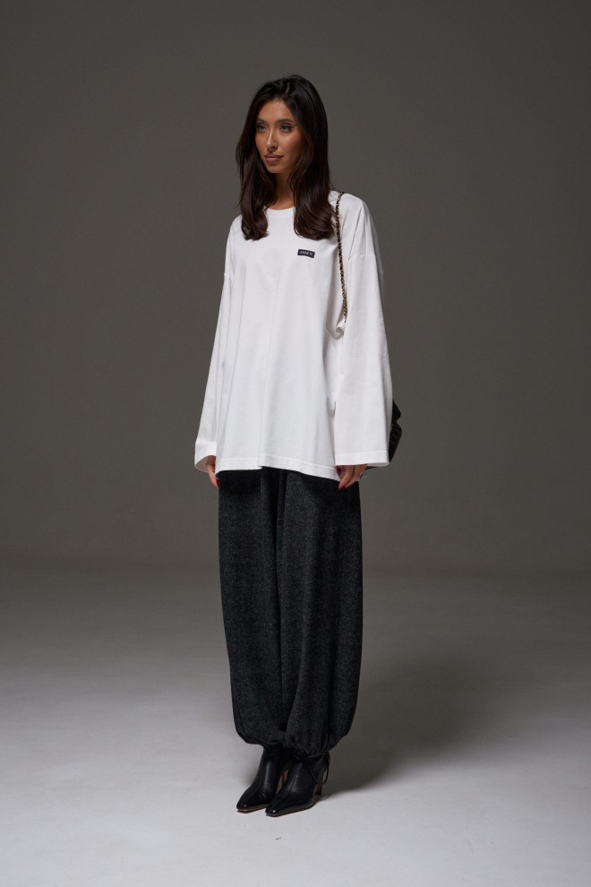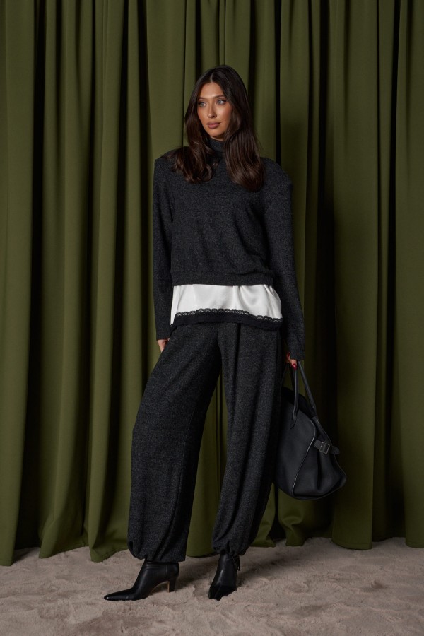 Брюки-джоггеры. Выполнены из мягкого ворсистого трикотажного полотна темно-серого цвета. Характеристики: прямой крой, пояс на шнурке-резинке с фиксатором, в боковых швах карманы, штанина внизу на резинке с фиксатором. Длина 103см.