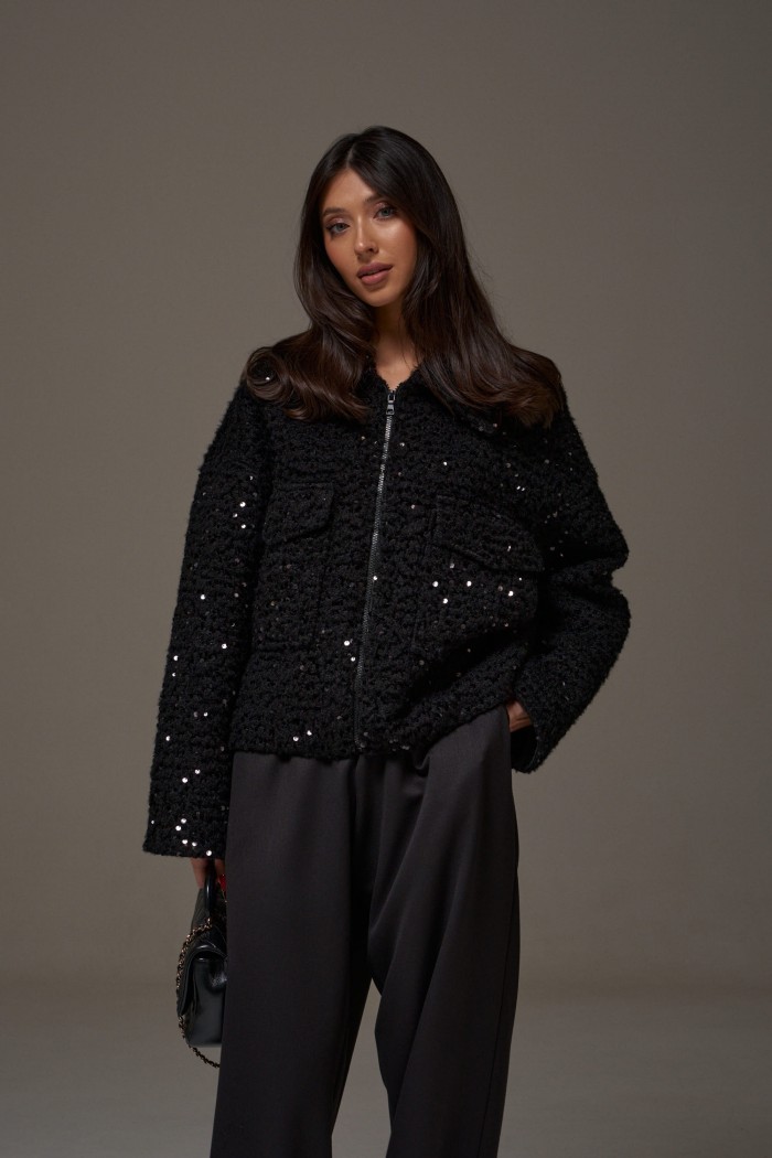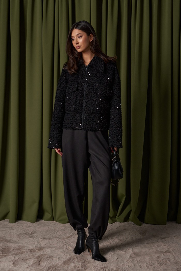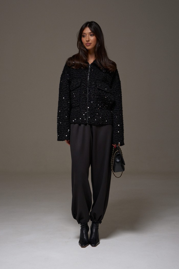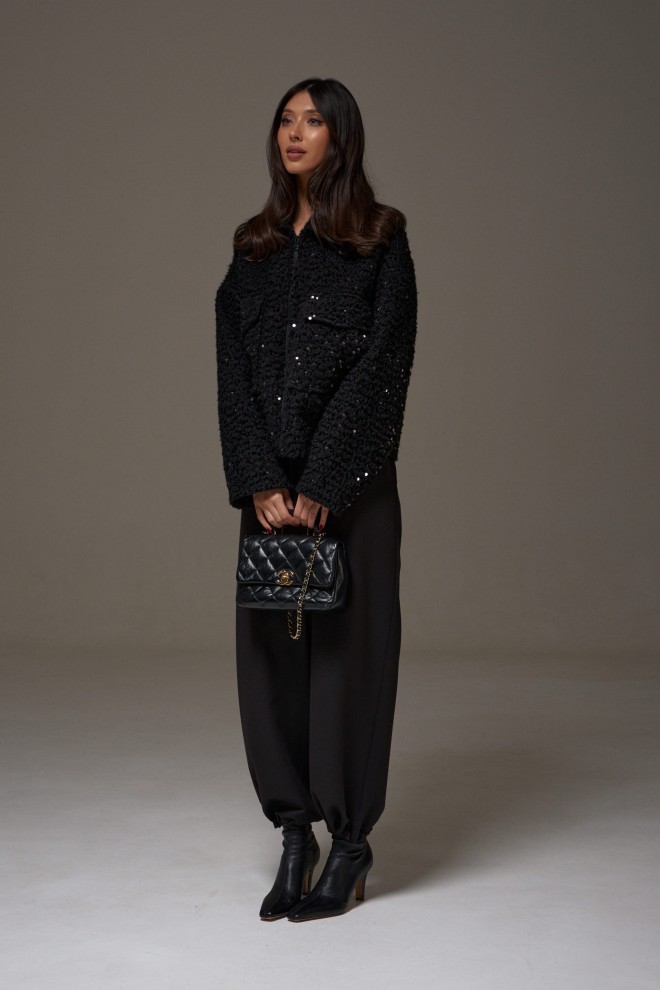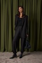 Брюки свободного кроя. Выполнены из плотной текстильной ткани чёрного цвета. Пояс на резинке. Застёжки нет. В боковых швах карманы. Низ брючины на резинке с фиксатором (регулируется). Длина брюк 100 см
