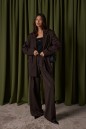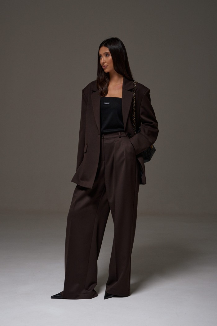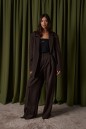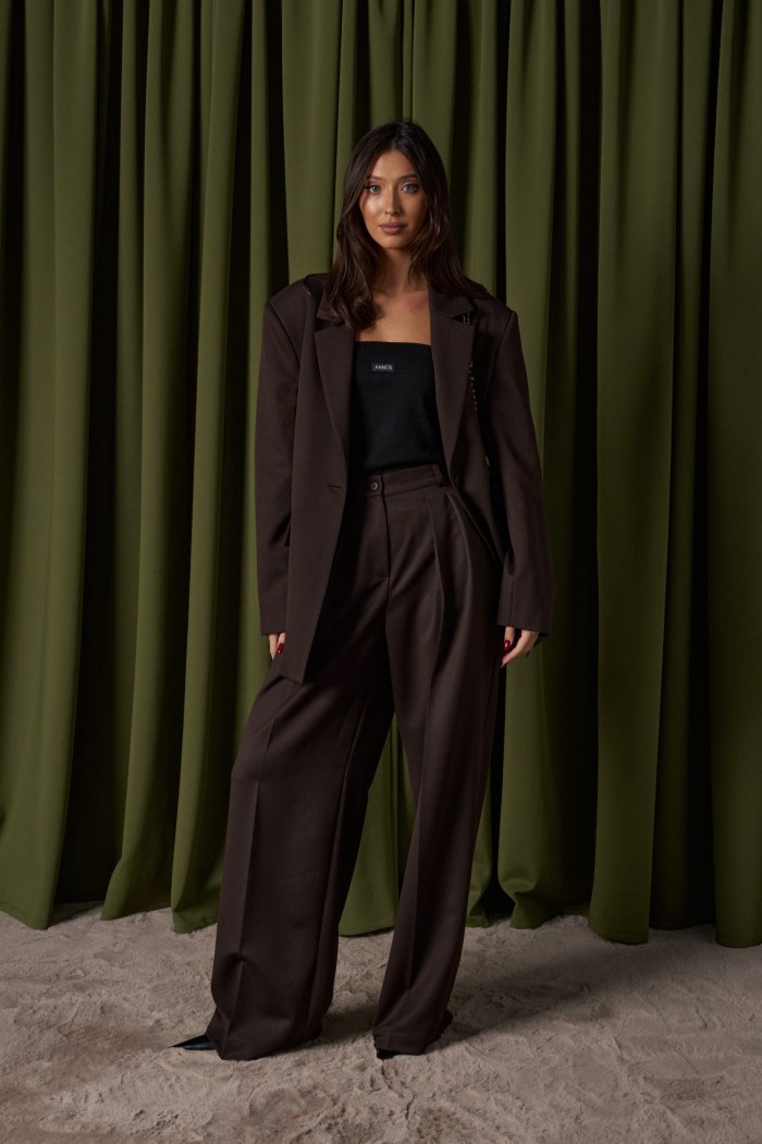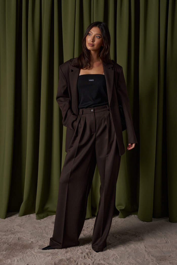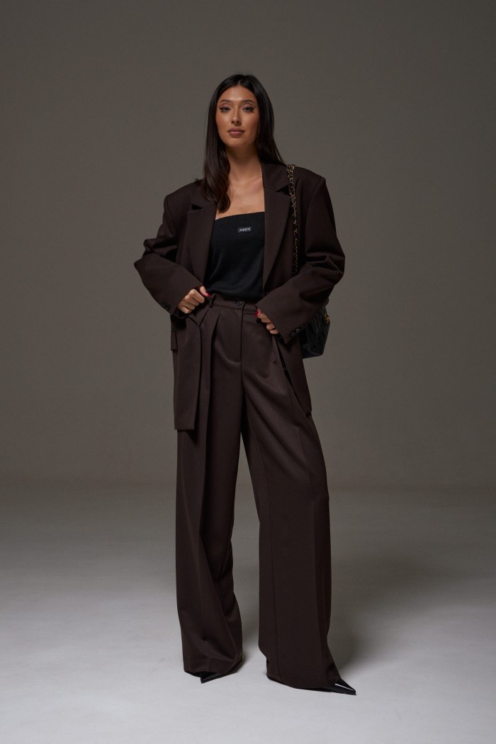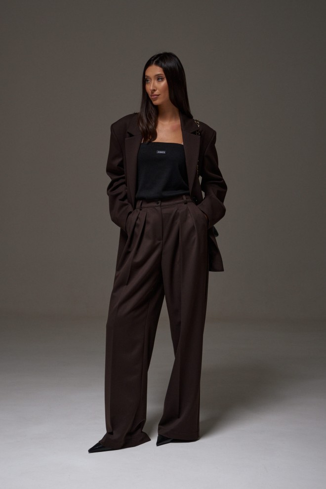 Брюки прямого свободного кроя выполнены из полотна коричневого цвета.