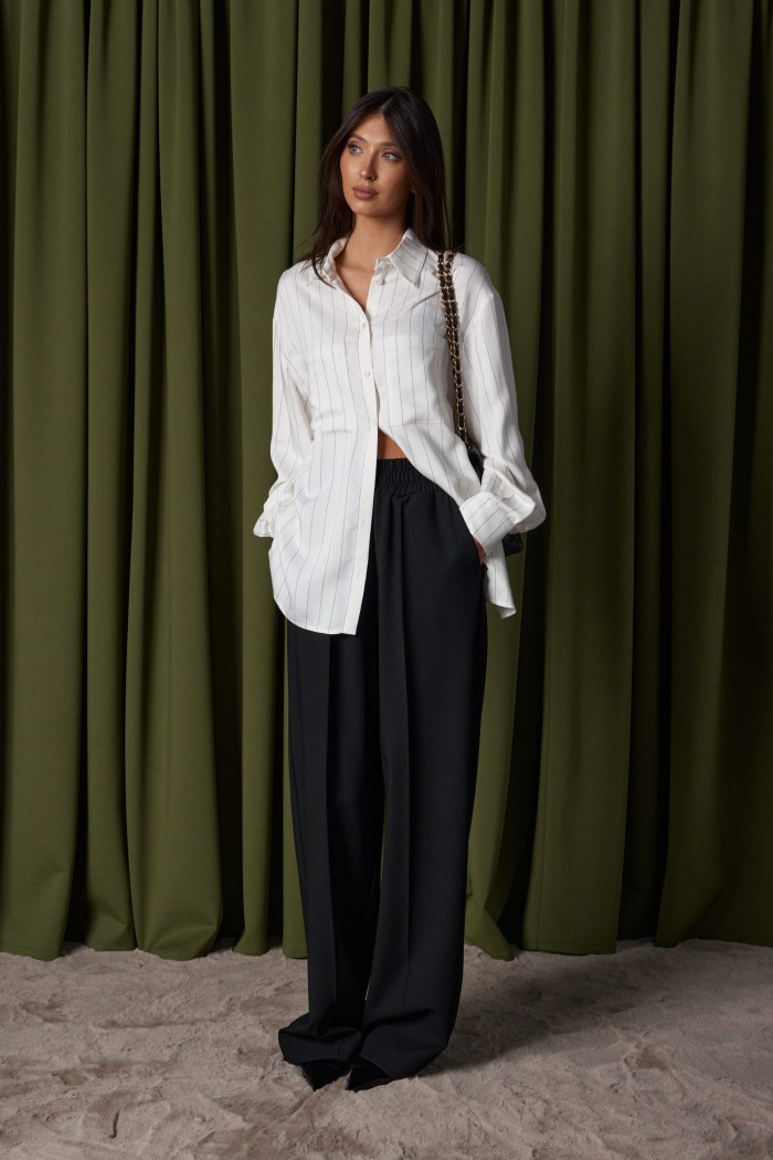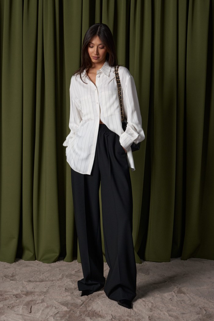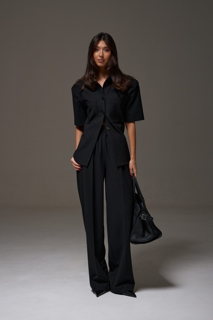 Брюки прямого кроя выполнены из костюмной ткани черного цвета. Характеристики: прямой крой, широкая резинка 7 см из основной ткани, боковые карманы, на передних и задних частях брюк заутюжены стрелки. Длина брюк 109 см.