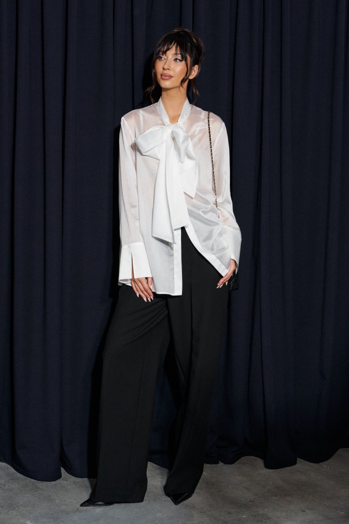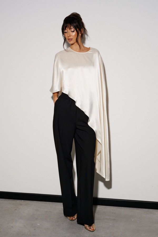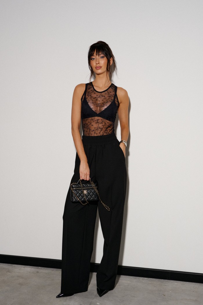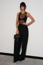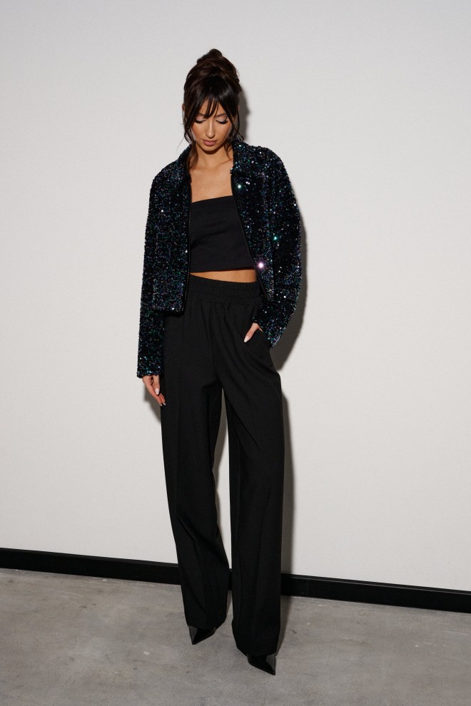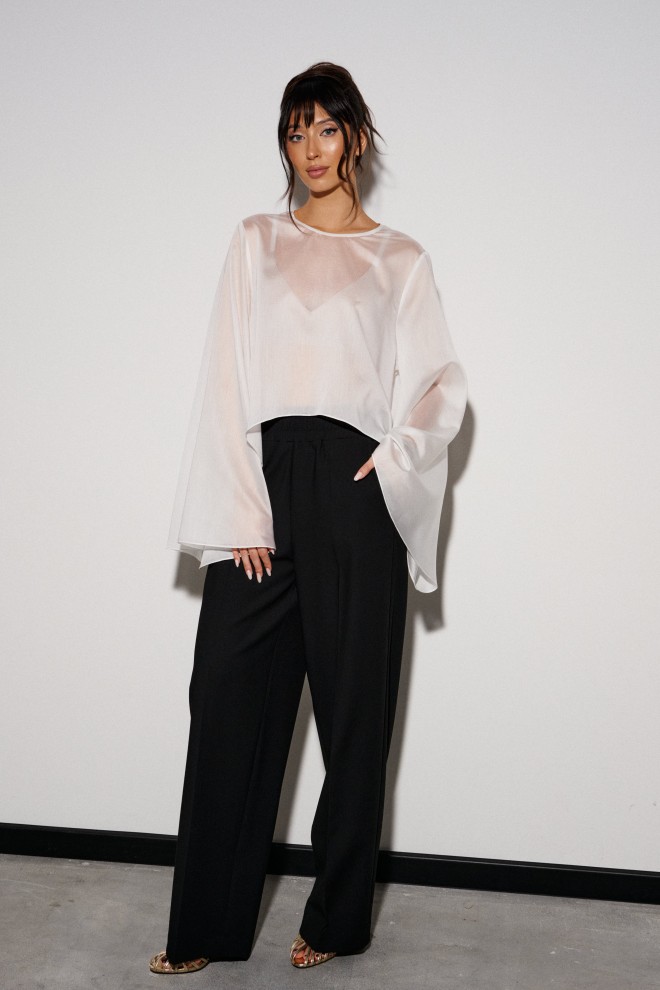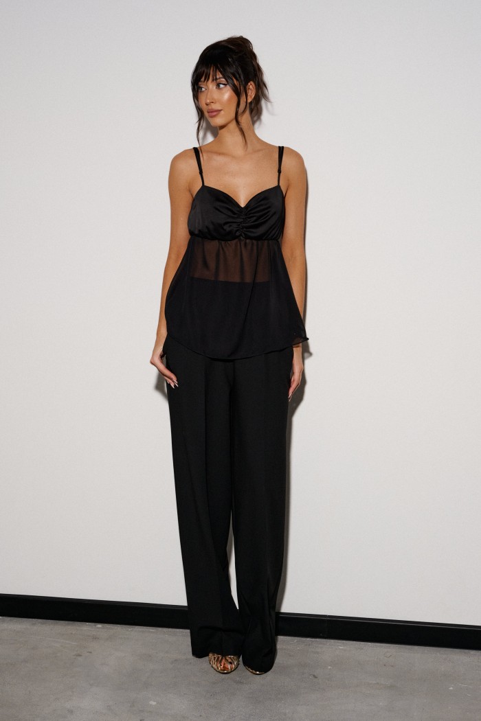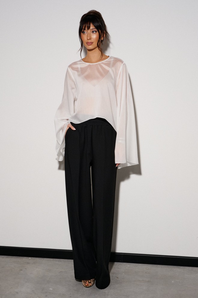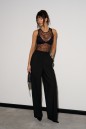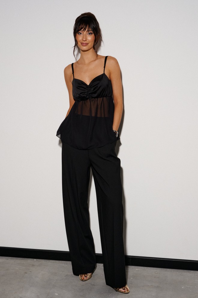Брюки прямого кроя выполнены из костюмной ткани черного цвета. Характеристики: прямой крой, широкая резинка 7 см из основной ткани, боковые карманы, на передних и задних частях брюк заутюжены стрелки. Длина брюк 109 см.