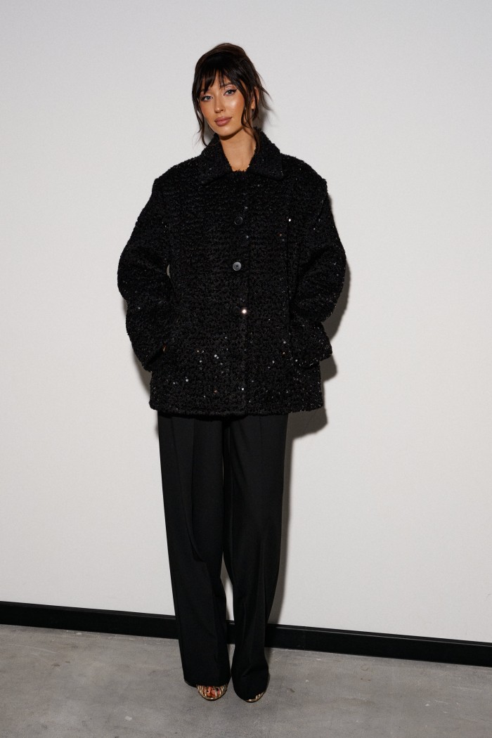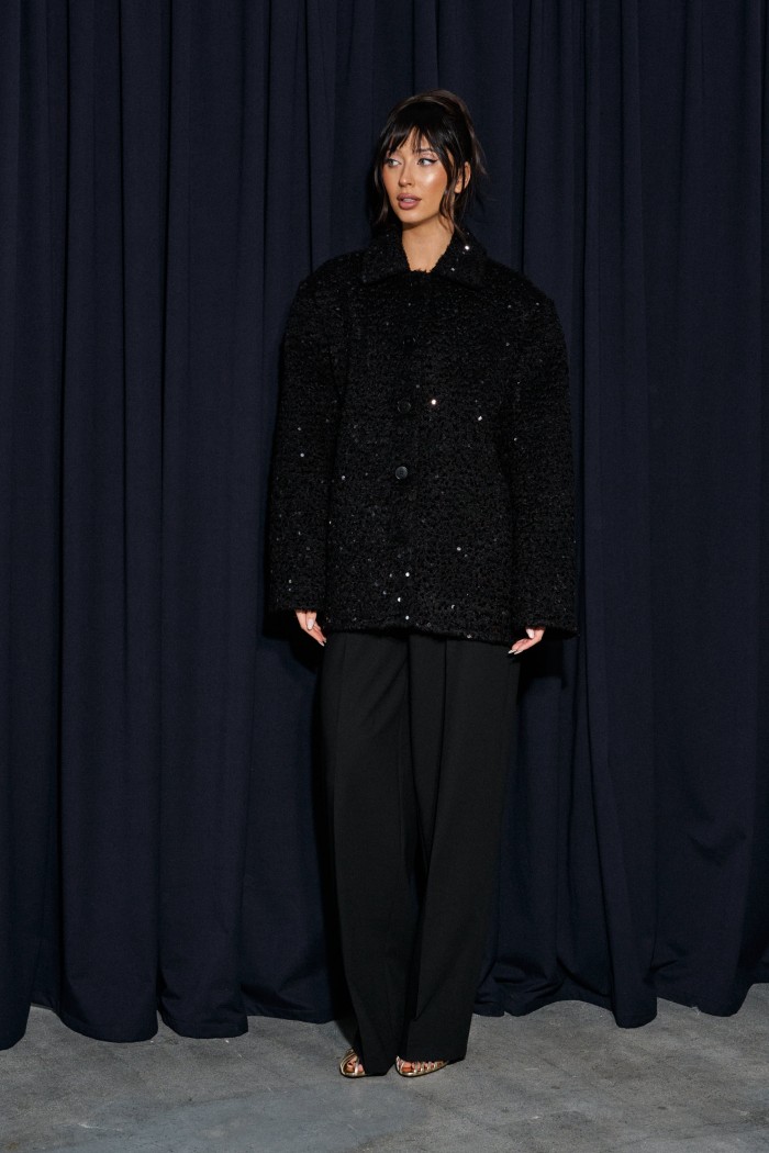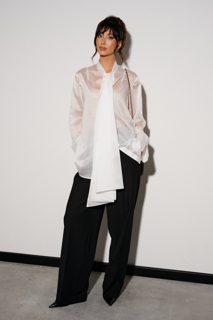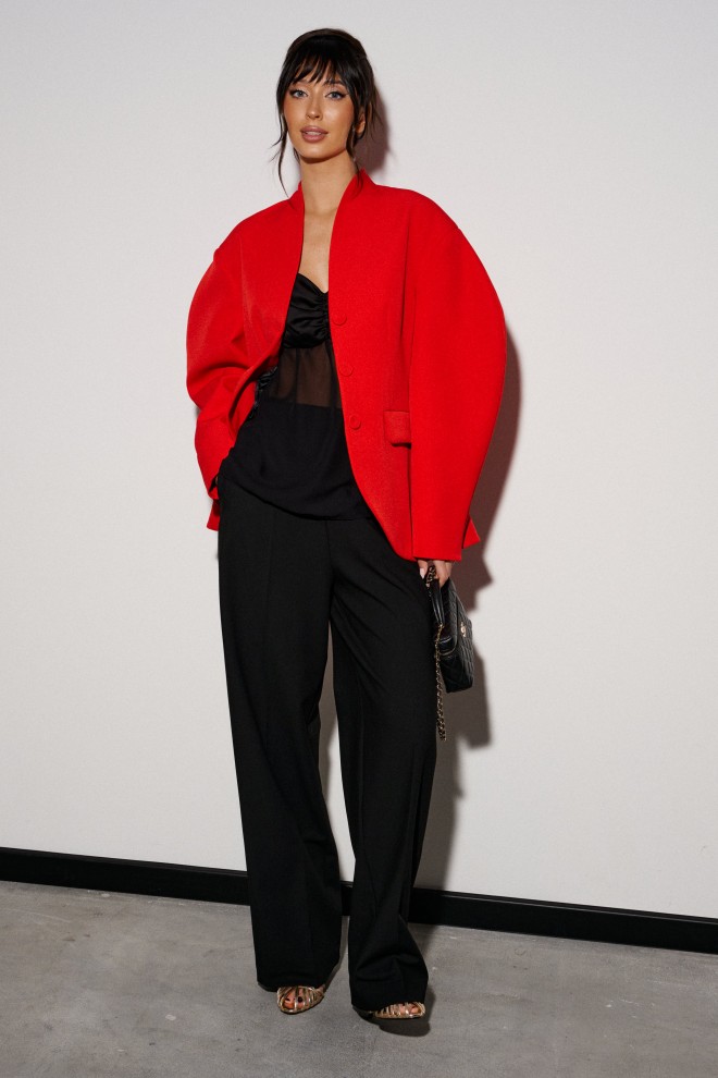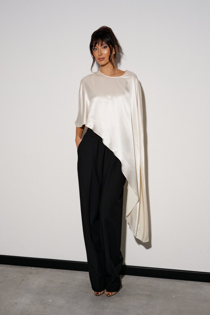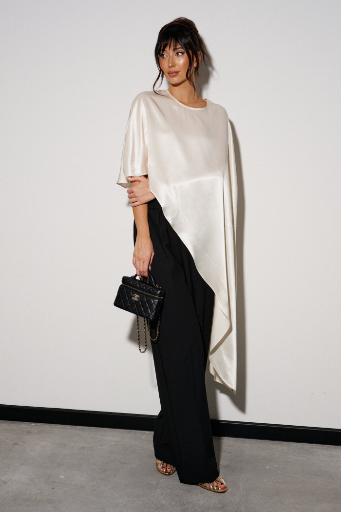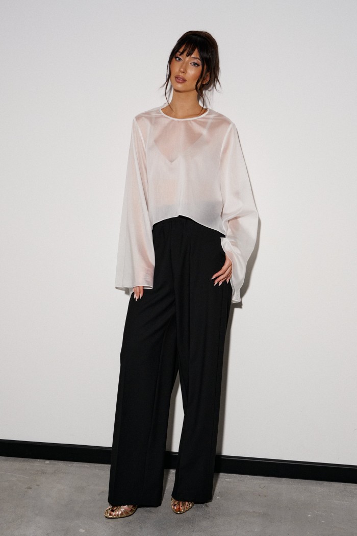 Брюки прямого кроя выполнены из костюмной ткани черного цвета. Характеристики: прямой крой, широкая резинка 7 см из основной ткани, боковые карманы, на передних и задних частях брюк заутюжены стрелки. Длина брюк 109 см.