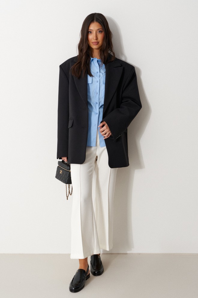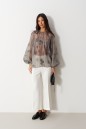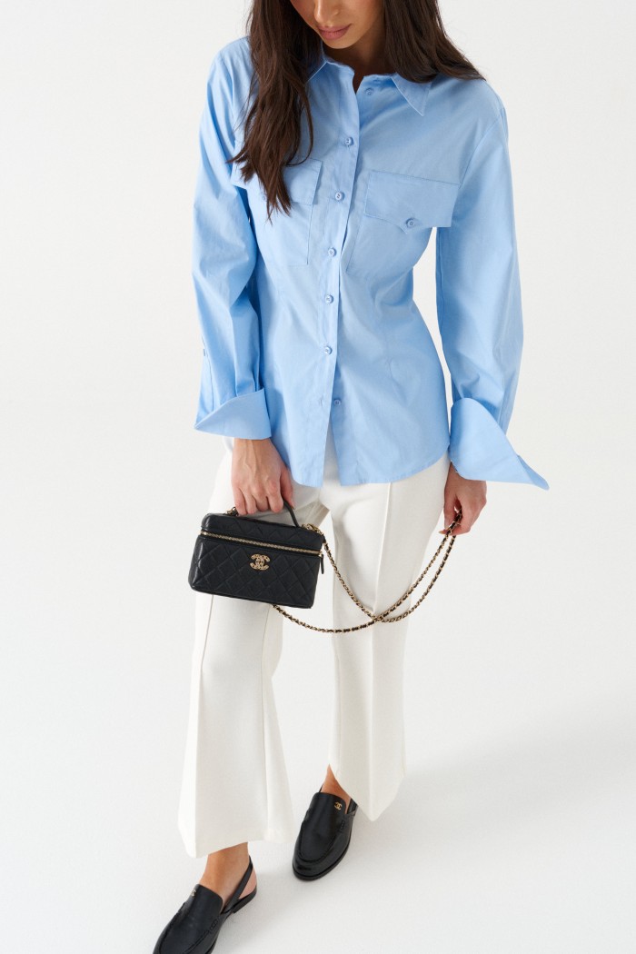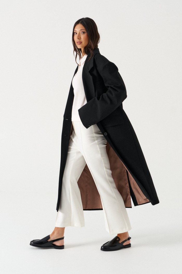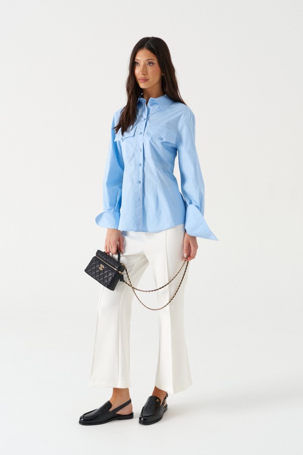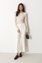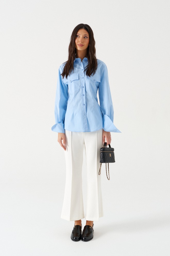 Брюки облегающего силуэта, расклешенные к низу, укороченные, выполнены из костюмной ткани молочного цвета. Характеристика: На задних частях брюк обработаны талиевые вытачки и заутюжены и отстрочены стрелки. По передней части заутюжены и отстрочены срелки. Застежка молния брючного типа с гульфиком и откоском. Пояс стабильный застегивающийся на петлю, пуговицу. Длина брюк по боковому шву 94 см.