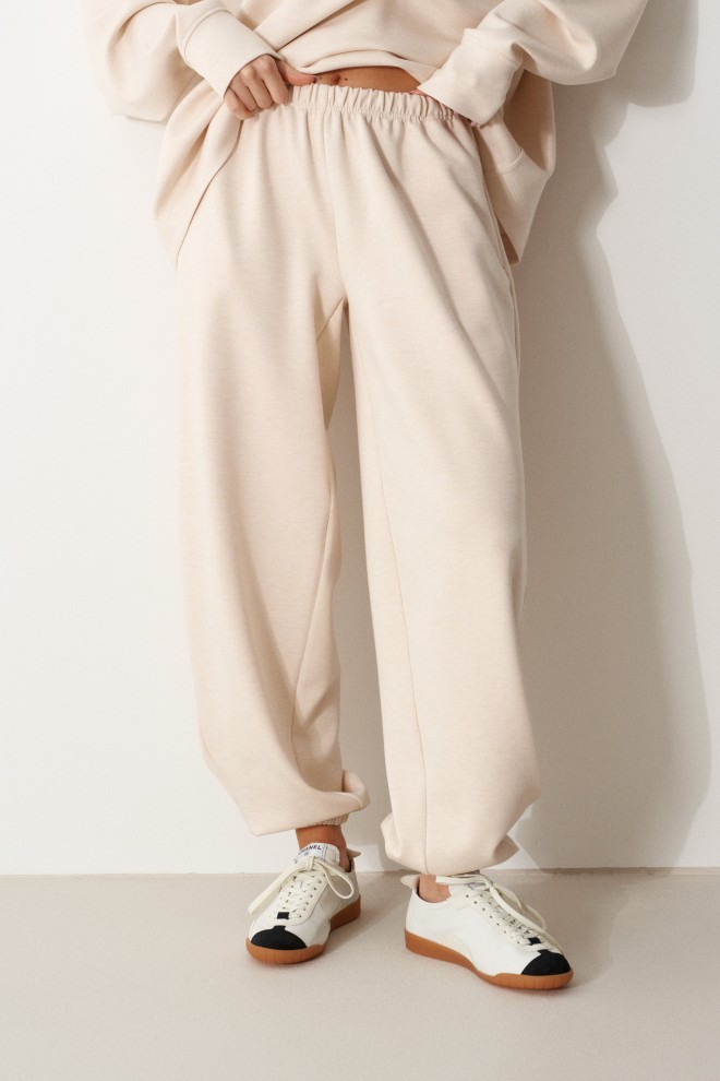 Брюки выполнены из трикотажного полотна молочного цвета. Характеристики: прямой крой, пояс на резинке с кулиской, в боковых швах карманы, накладные карманы на задней части брюк, штанина внизу на резинке с фиксатором. Длина по боковому шву 100 см.