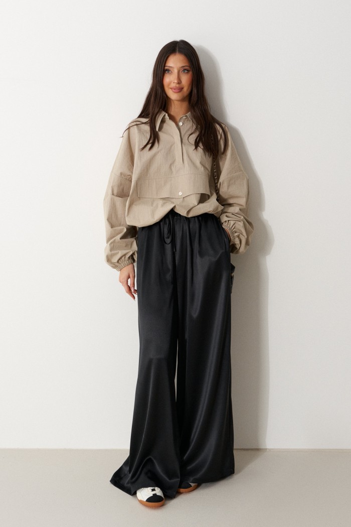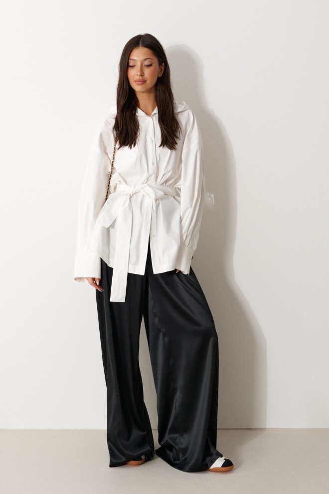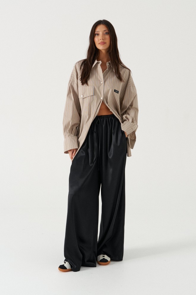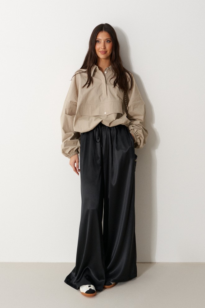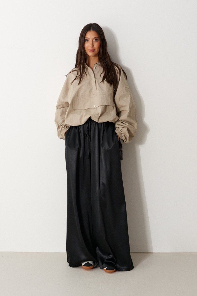 Брюки свободного кроя. Выполнены из мягкой струящейся ткани чёрного цвета. Пояс на резинке, со шнурочком. В боковых швах карманы. Длина бокового шва (с учётом пояса) 107 см