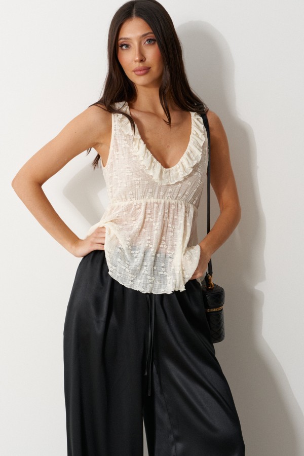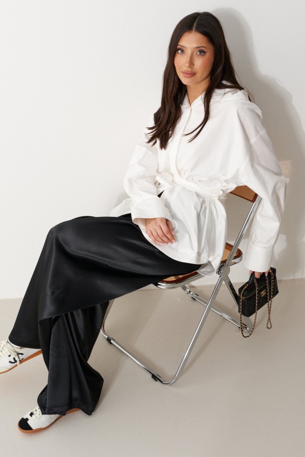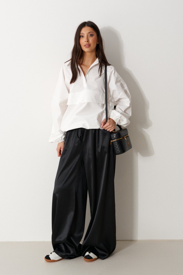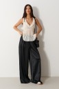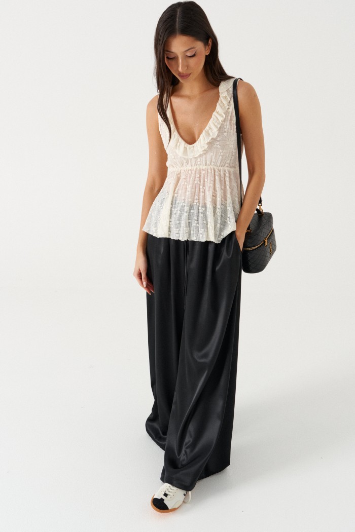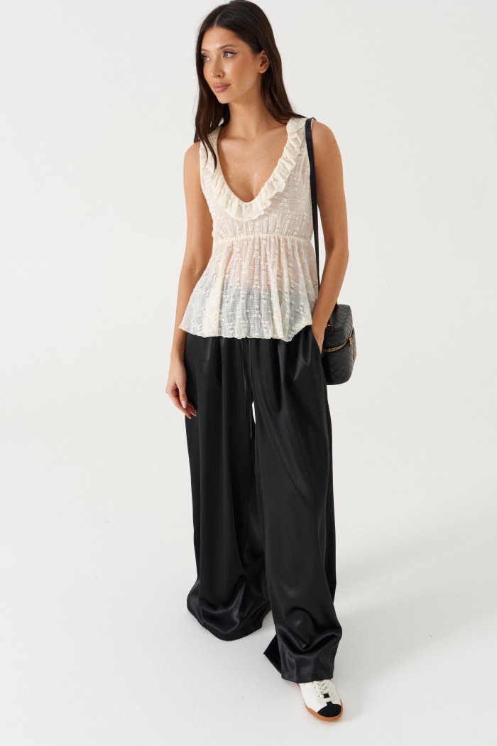 Брюки свободного кроя. Выполнены из мягкой струящейся ткани чёрного цвета. Пояс на резинке, со шнурочком. В боковых швах карманы. Длина бокового шва (с учётом пояса) 107 см