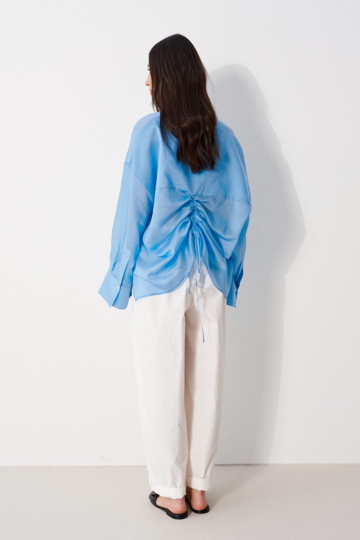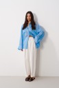 Брюки прямого свободного кроя, выполнены из хлопкового полотна белого цвета. Характеристика: прямой крой, застежка центральная на пуговицу и замок, скрывающийся под гульфиком, пояс частично на резинке ( со спинки ), в боковых швах карманы, по передней части изделия декоративные складки. Длина брюк по боковому шву 105 см