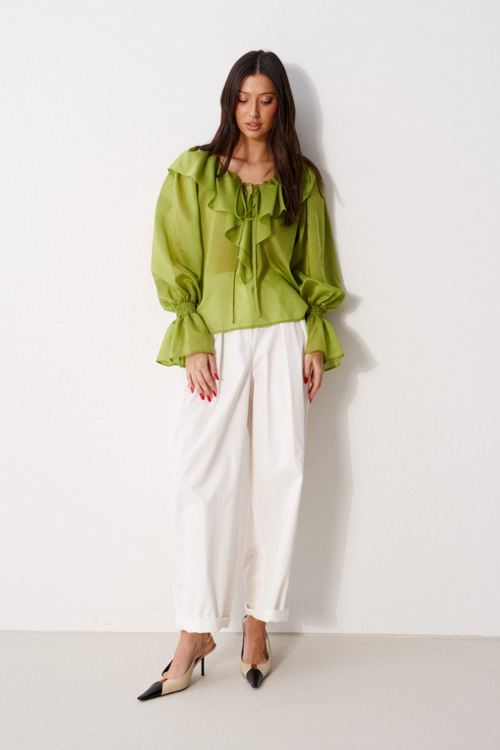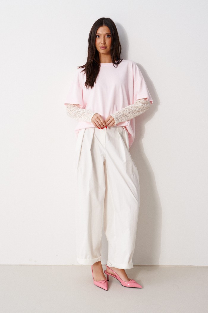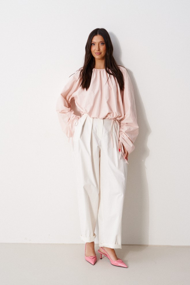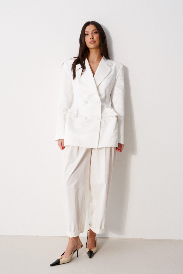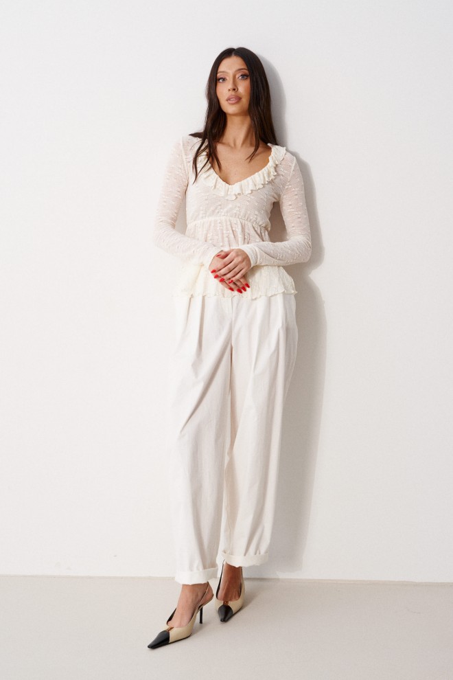 Брюки прямого свободного кроя, выполнены из хлопкового полотна белого цвета. Характеристика: прямой крой, застежка центральная на пуговицу и замок, скрывающийся под гульфиком, пояс частично на резинке ( со спинки ), в боковых швах карманы, по передней части изделия декоративные складки. Длина брюк по боковому шву 105 см