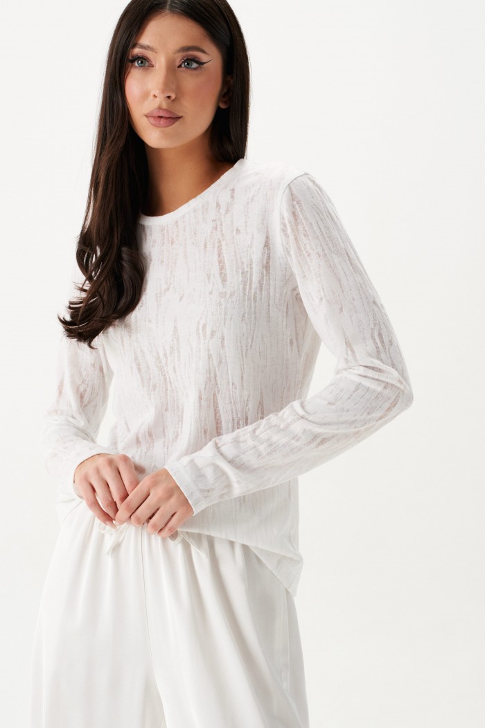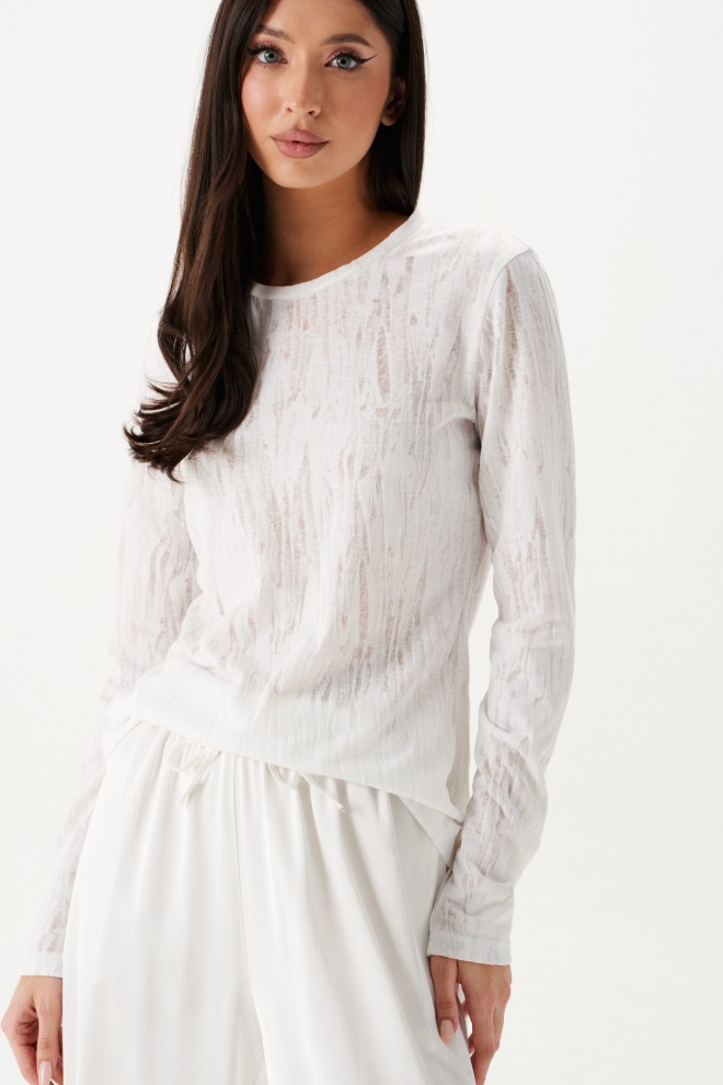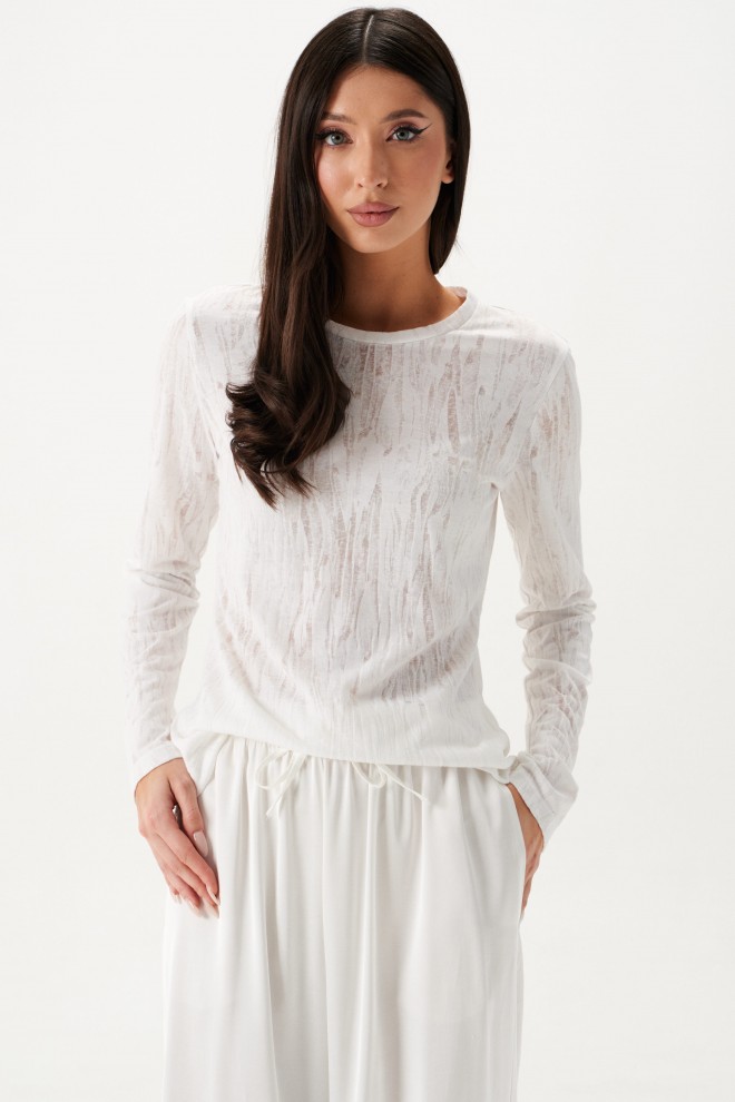 Джемпер выполнен из трикотажного полотна полупрозрачного светлого цвета. Характеристики: полуприлегающий силуэт, овальная горловина, рукав втачной. Длина по спинке 60см, длина рукава 63см