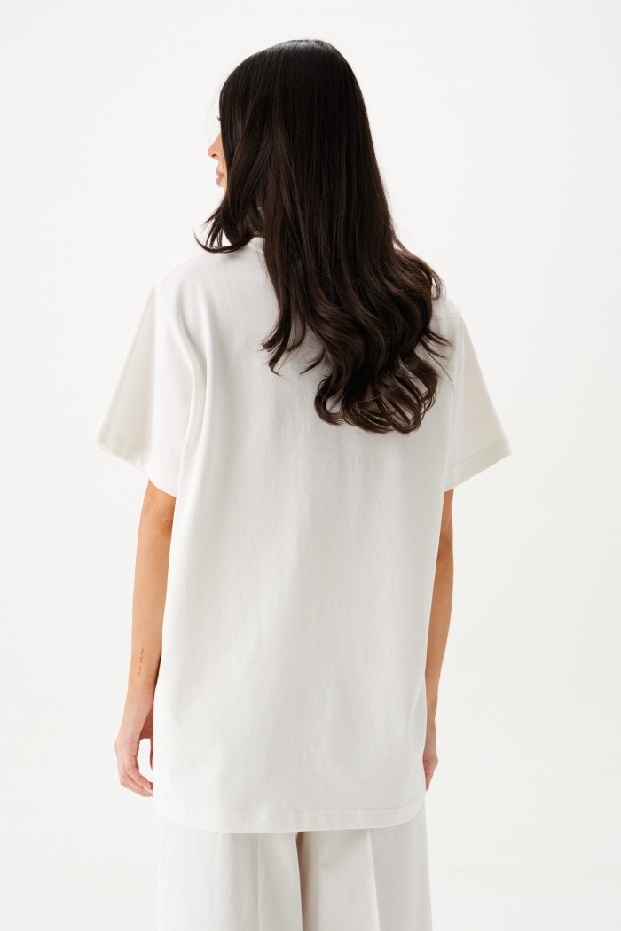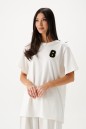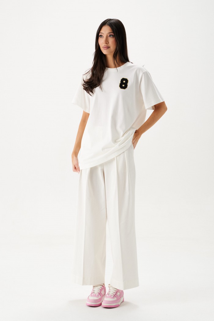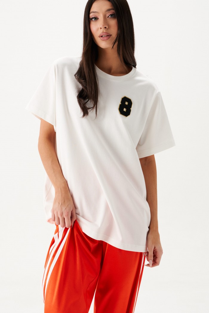 Футболка прямого свободного кроя, выполнена из хлопкового полотна тепло-белого цвета . Характеристики: прямой свободный крой, горловина овальная, рукав слегка спущен, горловина выполнена из довяза, спереди апликация в виде цифры восемь. Длина по центру спинки от края горловины 71 см, длина рукава от края горловины 34 см.