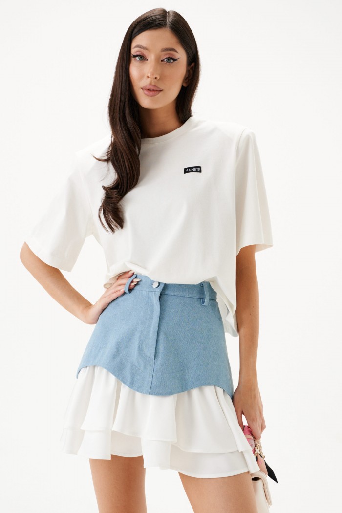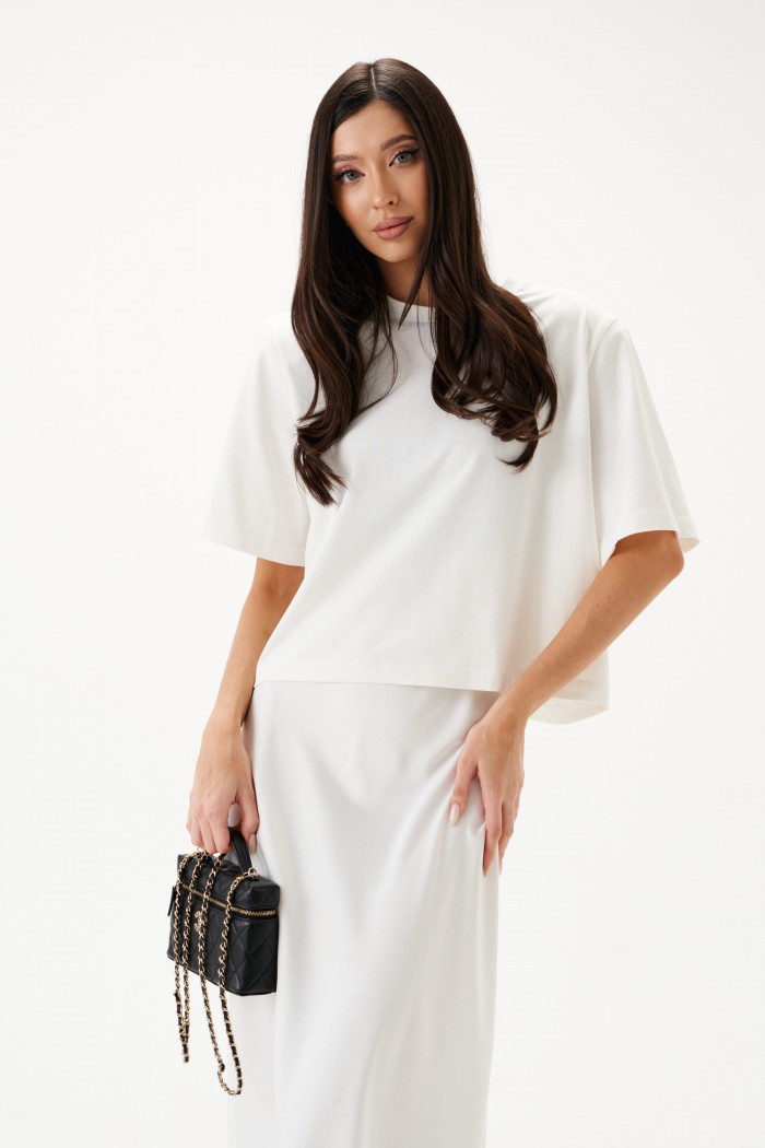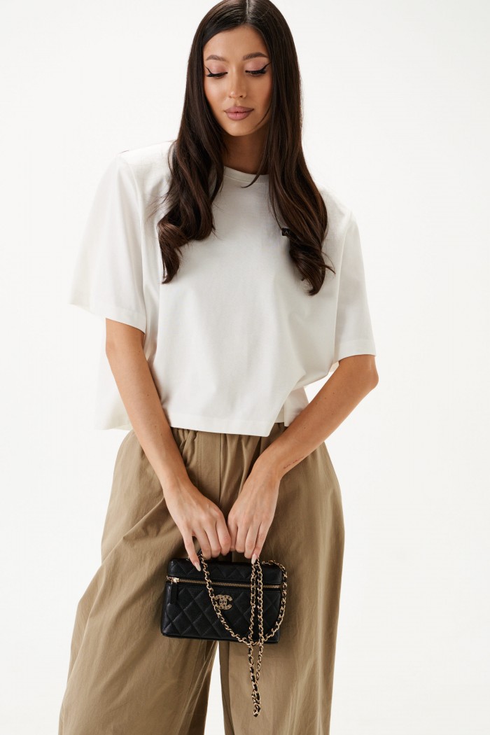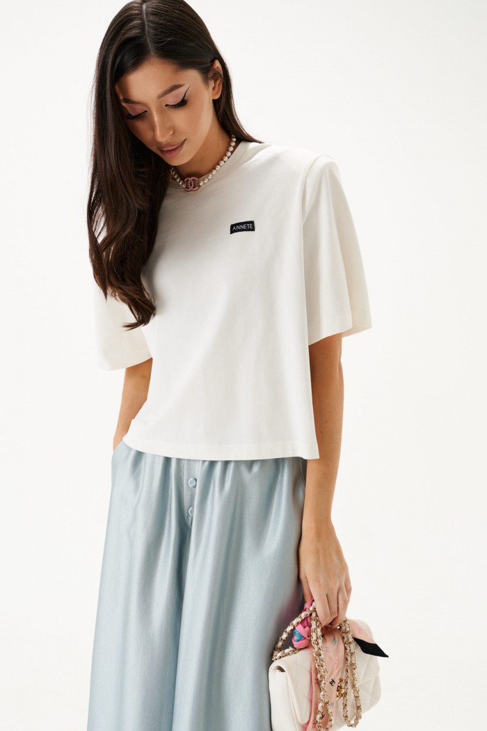 Джемпер (футболка) прямого свободного кроя с акцентными плечами выполнен из хлопкового полотна белого цвета.