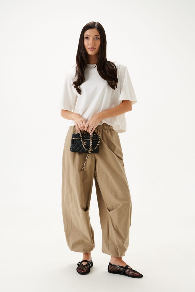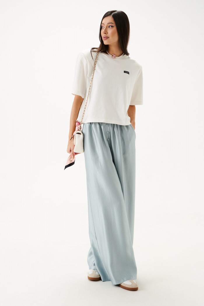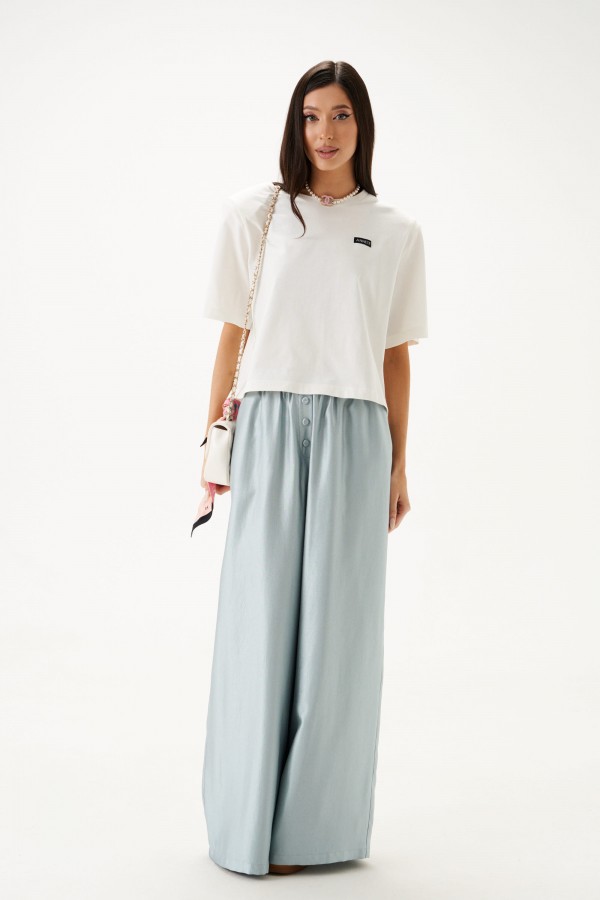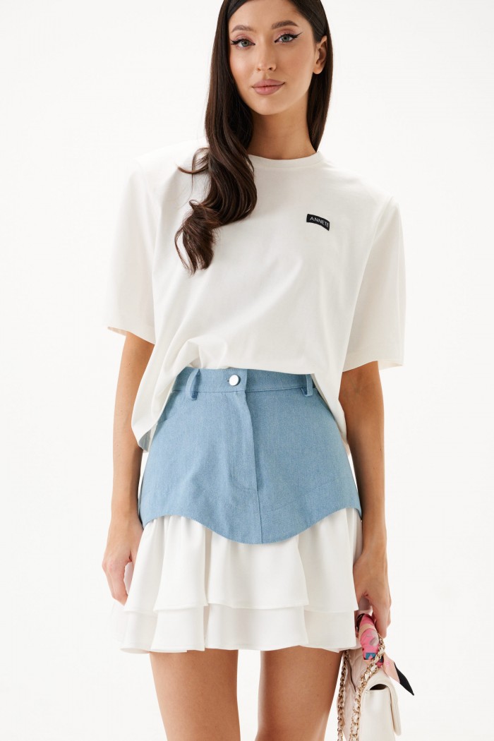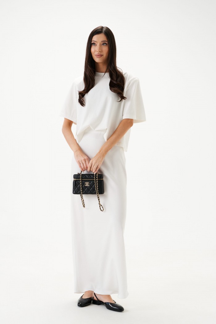 Джемпер (футболка) прямого свободного кроя с акцентными плечами выполнен из хлопкового полотна белого цвета.