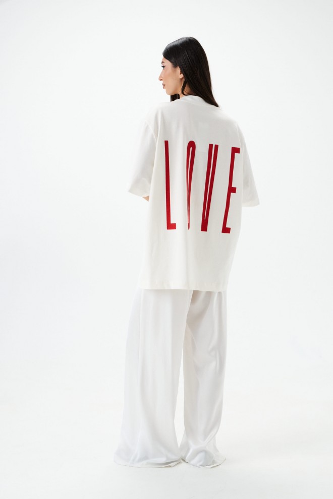 Футболка прямого кроя, выполнена из хлопкового полотная тепло-белого цвета. Характеристика: прямой свободный крой, горловина овальная, рукав слегка спущен, на спинке печать "LOVE" красного цвета. Длина по центру спинки от края горловины 75 см, длина рукава от края горловины 39 см.