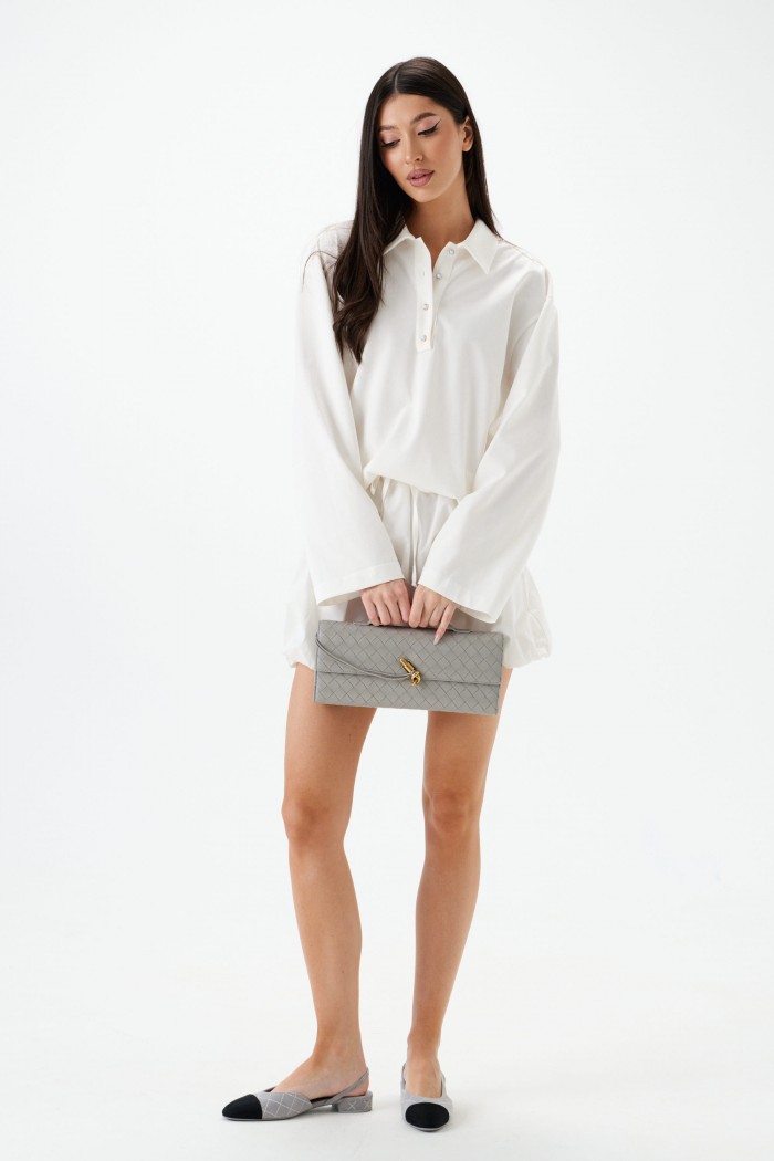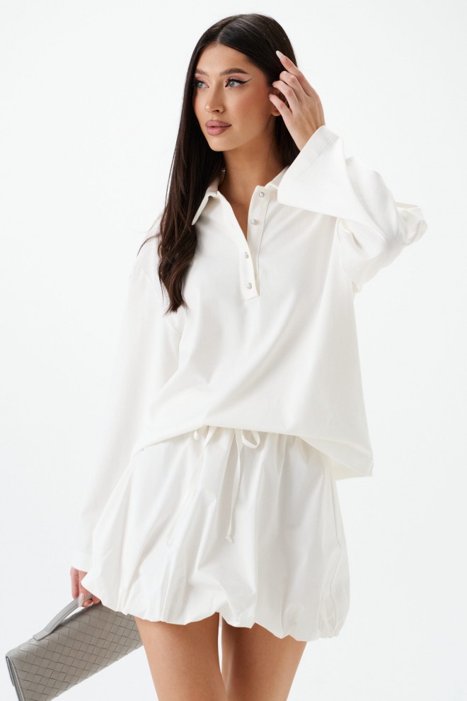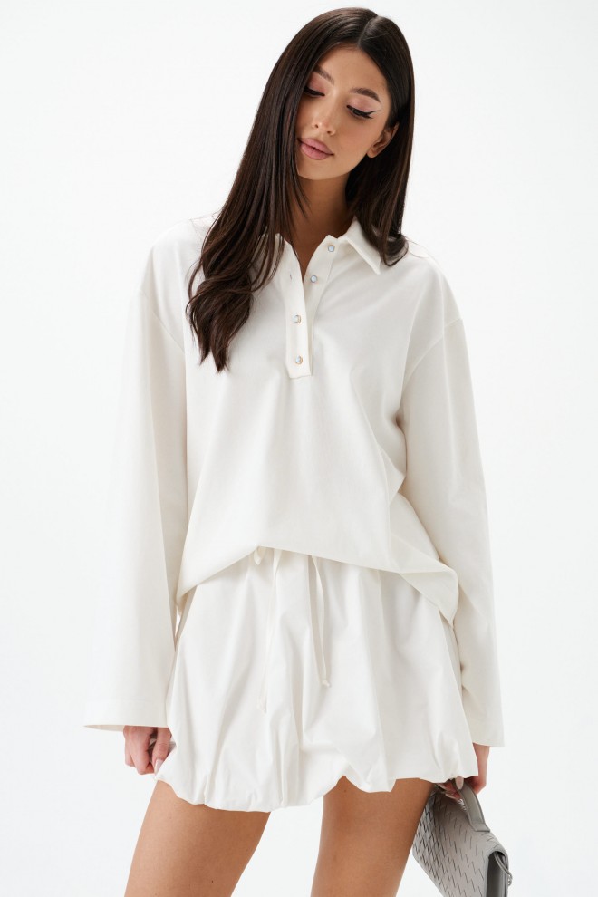 Джемпер-поло. Выполнен из трикотажного полотна. Прямой крой. Отложной воротник. Застёжка – пуговички. Рукав втачной, немного спущен. Длина рукава от линии втачивания 57 см. Длина спинки 59 см