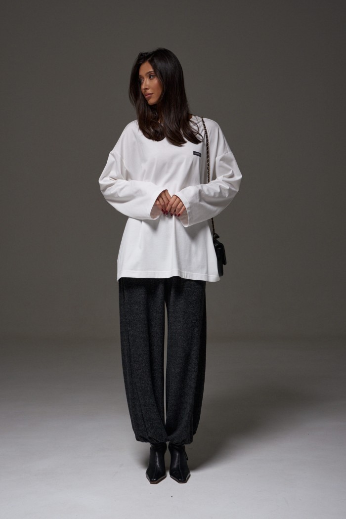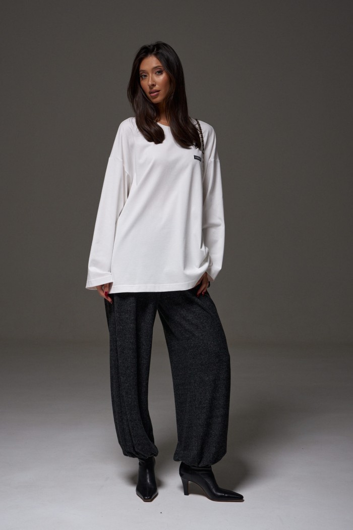 Джемпер прямого свободного кроя,выполнен из трикотажного полотна белого цвета. Характеристики: прямой крой, овальный вырез горловины, спинка цельнокроеная, по переду брендированная нашивка. Рукав длинный спущен. Длина по спинке 73 см, длина рукава от края горловины 78см.
