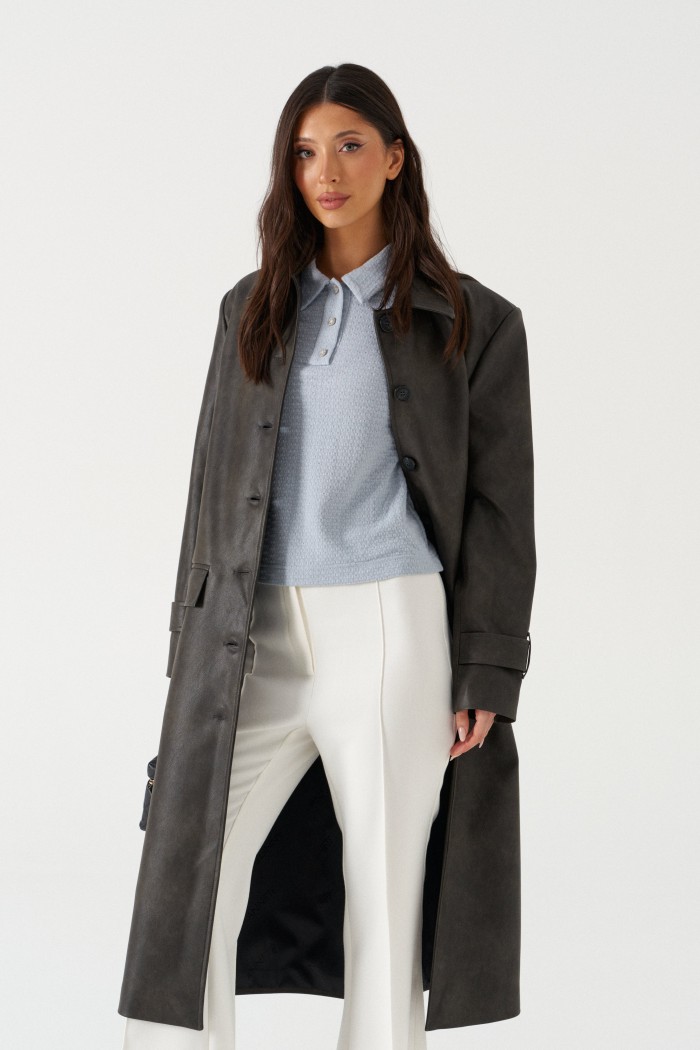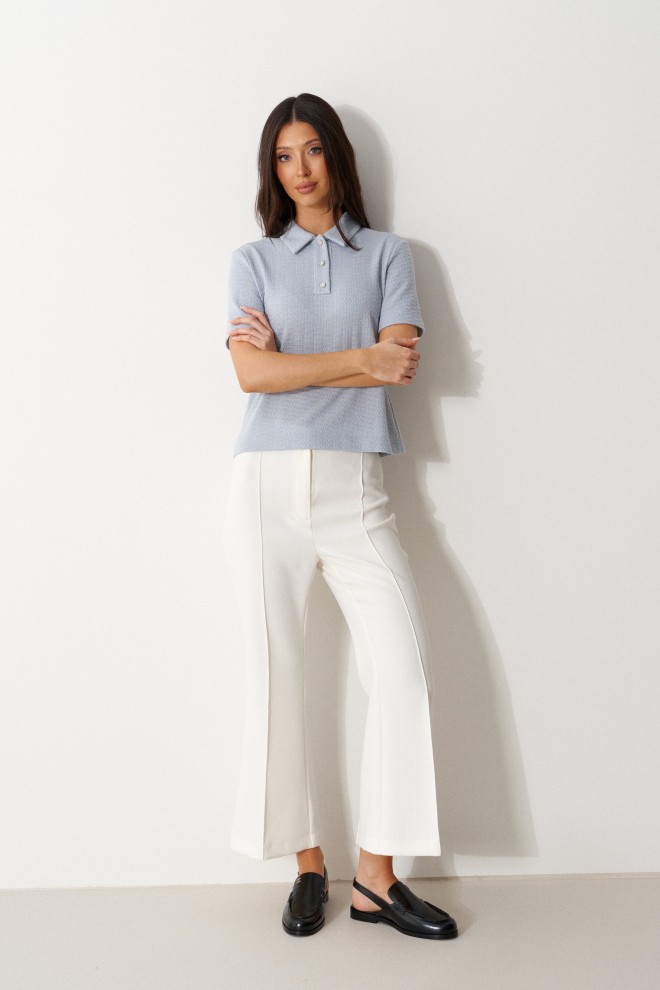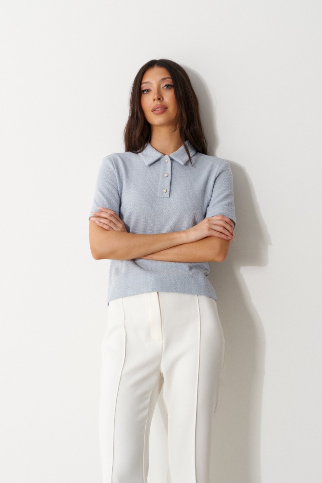 Джемпер-поло прямого кроя. Выполнен из фактурного трикотажа голубого цвета. Воротник отложной. Застёжка пуговички на планке. Рукав втачной, короткий. Длина спинки 54 см. Длина рукава от линии втачивания 21 см