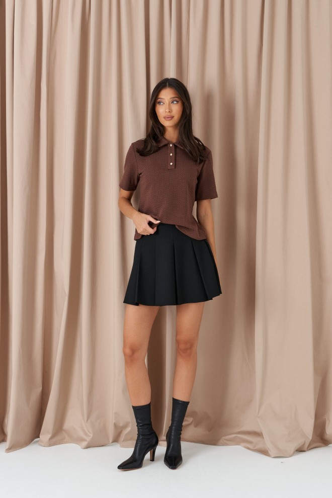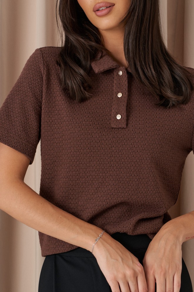 Джемпер-поло прямого кроя. Выполнен из фактурного трикотажа шоколадного цвета. Воротник отложной. Застёжка пуговички на планке. Рукав втачной, короткий. Длина спинки 54 см. Длина рукава от линии втачивания 21 см