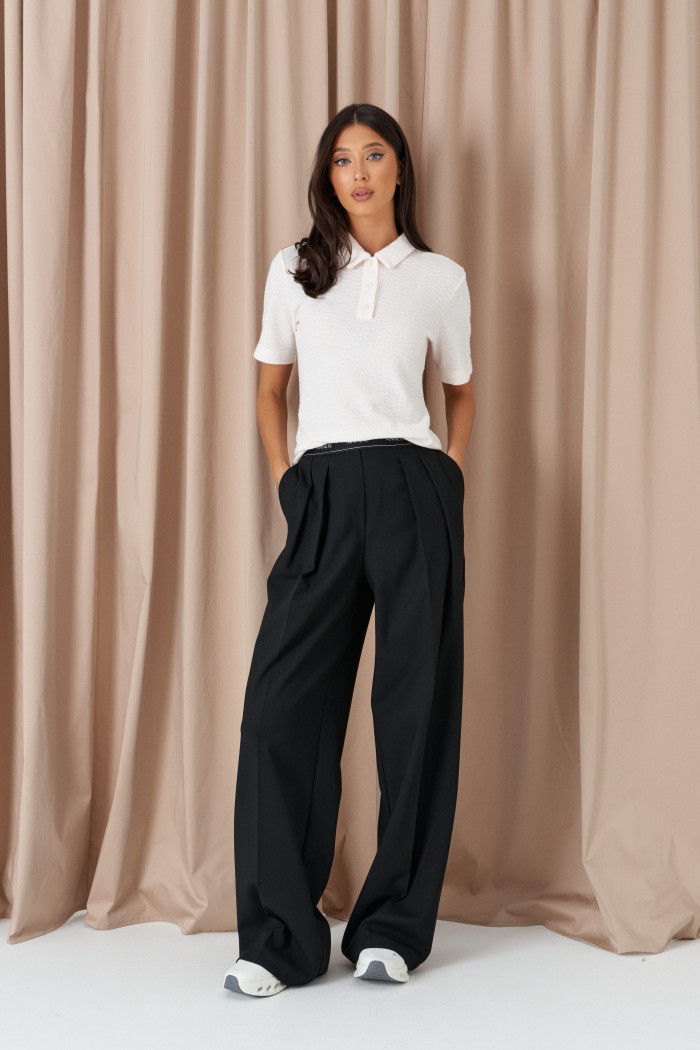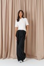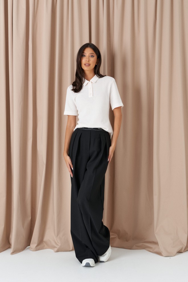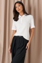 Джемпер-поло прямого кроя. Выполнен из фактурного трикотажа белого цвета. Воротник отложной. Застёжка пуговички на планке. Рукав втачной, короткий. Длина спинки 54см. Длина рукава от линии втачивания 21 см