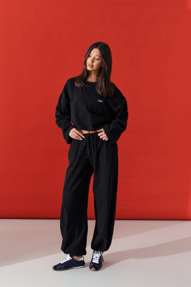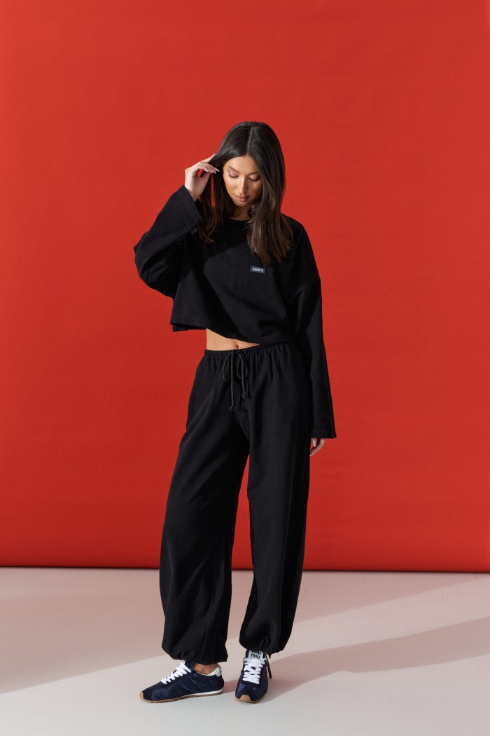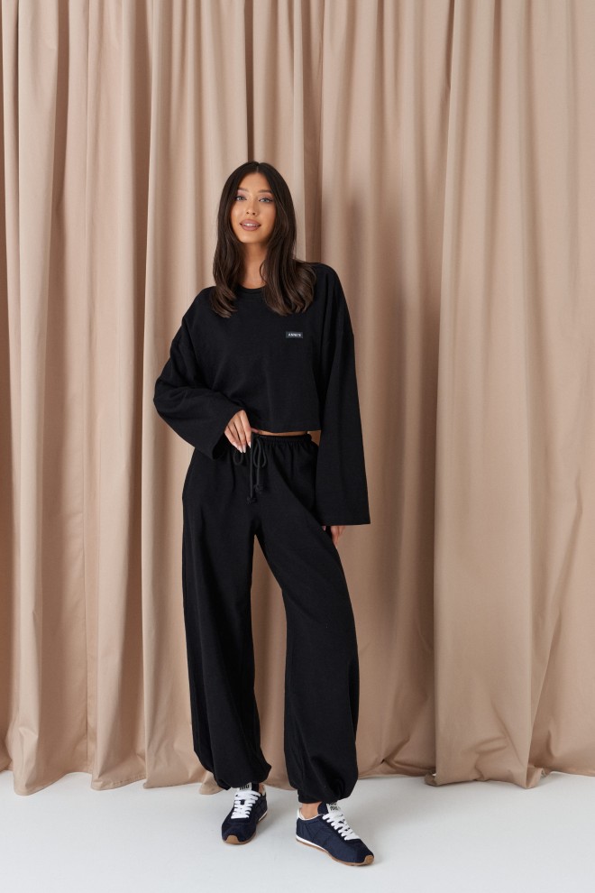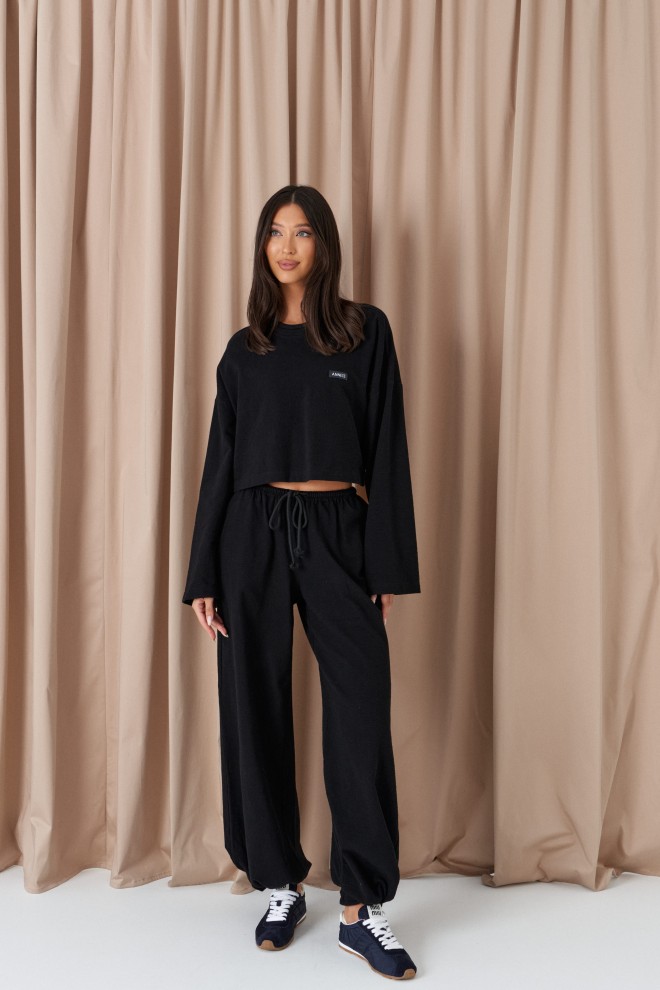 Джемпер прямого свободного кроя,выполнен из трикотажного полотна черного цвета. Характеристики: прямой крой, овальный вырез горловины, спинка цельнокроеная, по переду брендированная нашивка, рукав спущен. Длина по спинке 41 см, длина рукава от края горловины 76см.