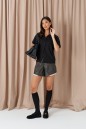 Джемпер свободного кроя, выполнен из трикотажного полотна черного цвета. Характеристика: отложной воротник с закругенными краями, центральная застежка на петли-пуговицы, чуть спущенное плечо, рукав вточной, короткий. Длина рукава от горловины 33см. Длина по спинке 60см