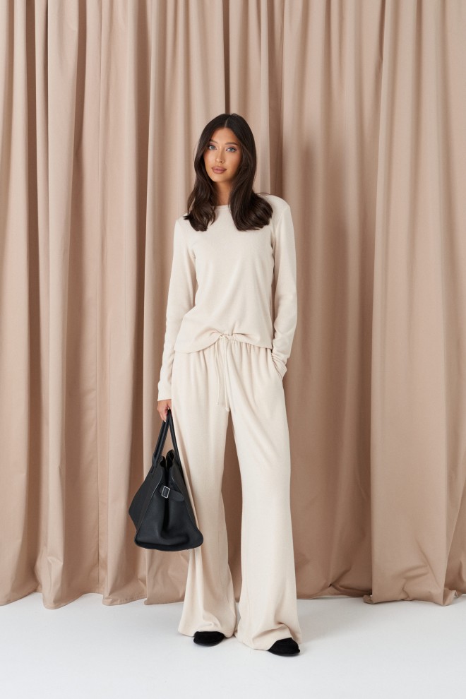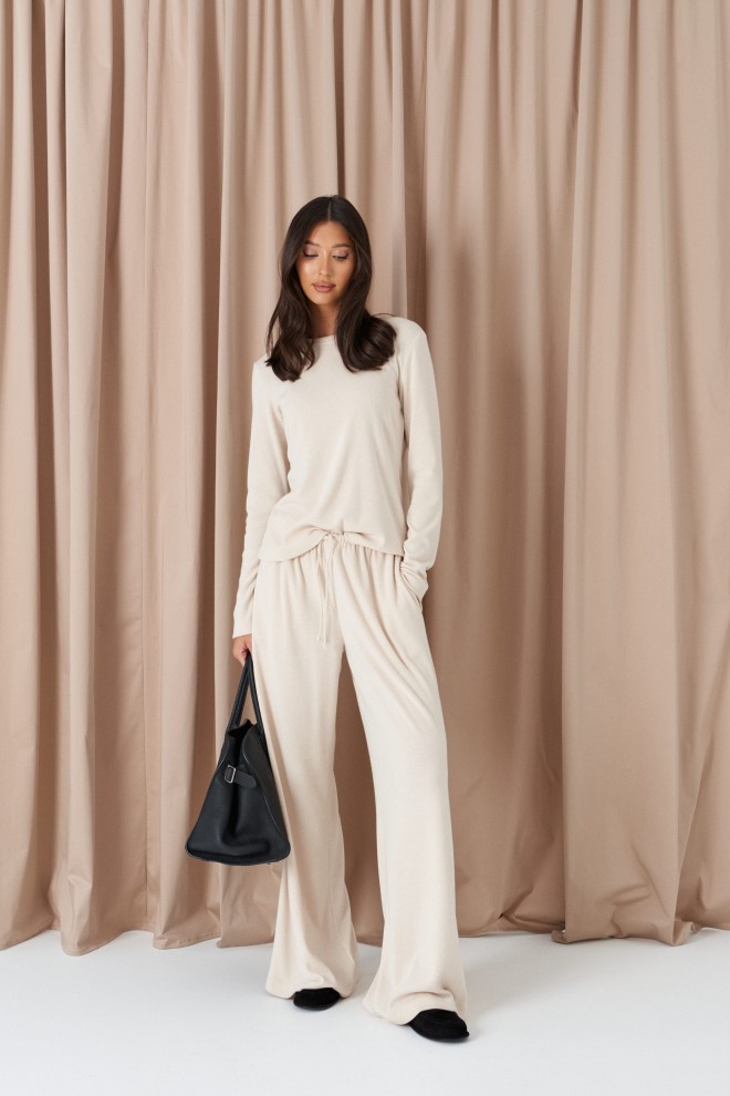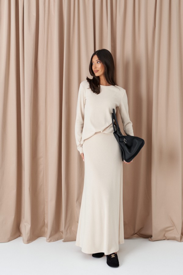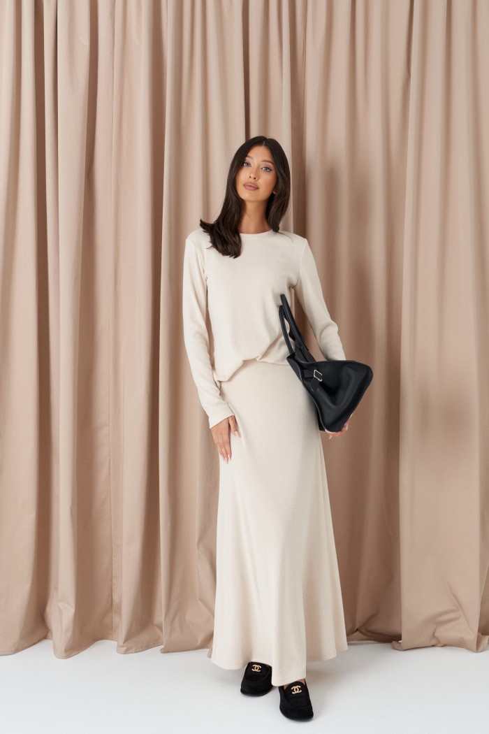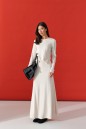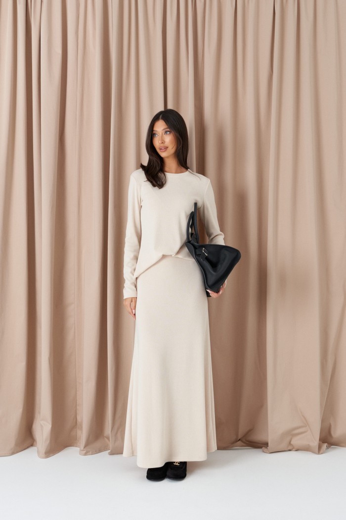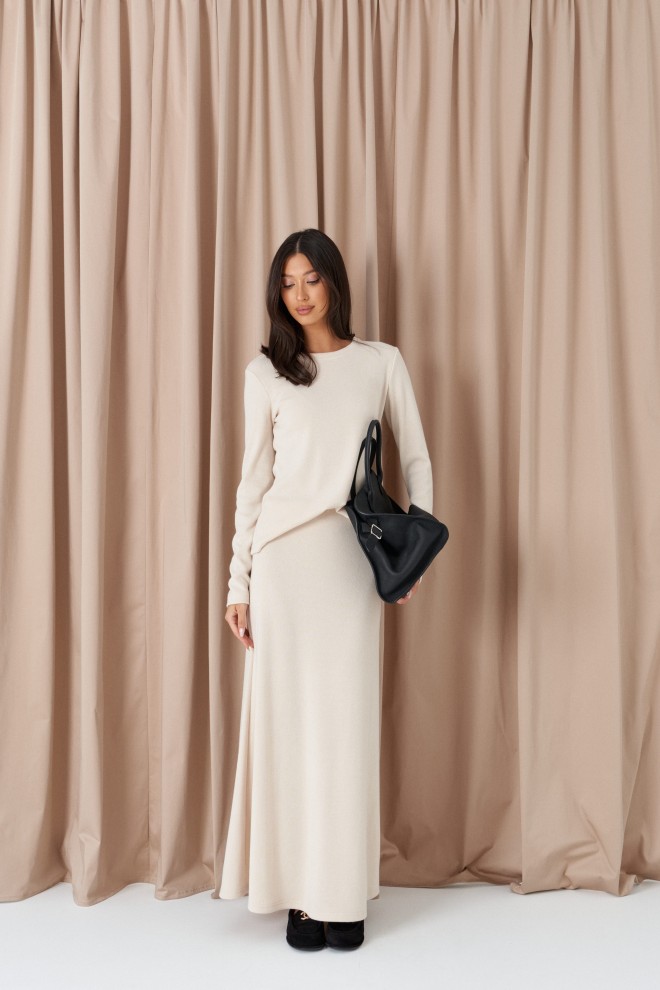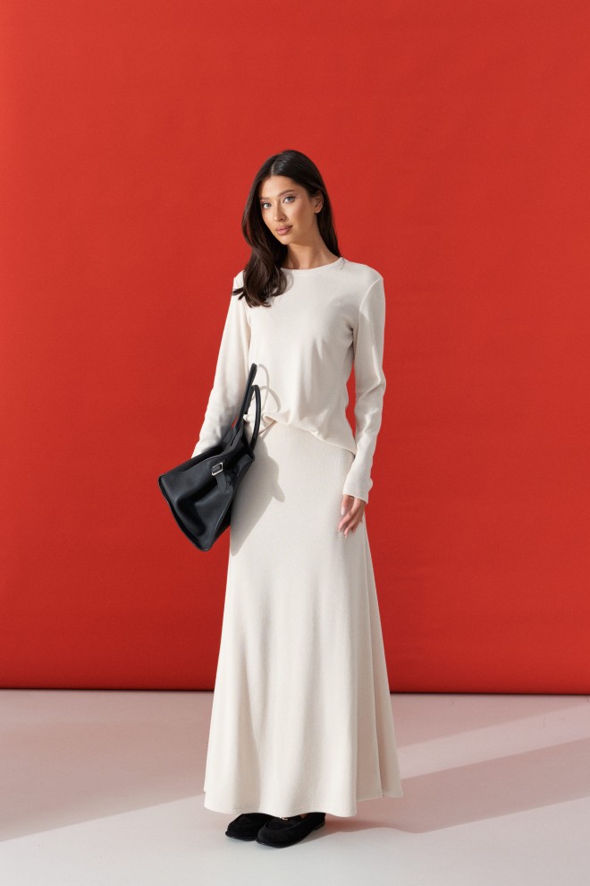 Джемпер выполнен из трикотажного полотна молочного цвета. Характеристики: полуприлегающий силуэт, овальная горловина. Рукав втачной, длина 63 см. Длина по спинке 58 см.