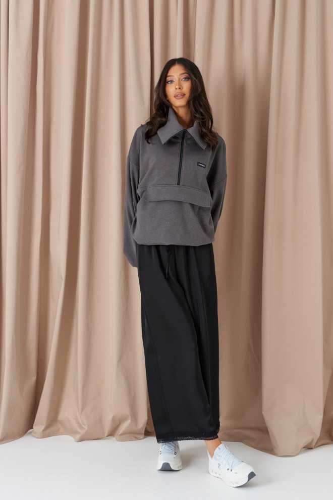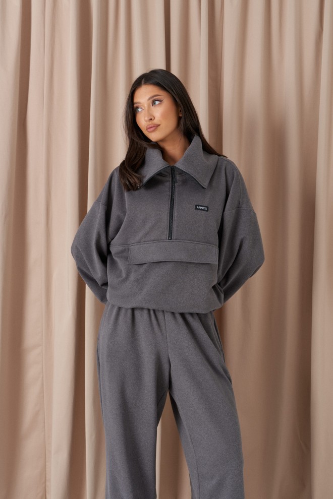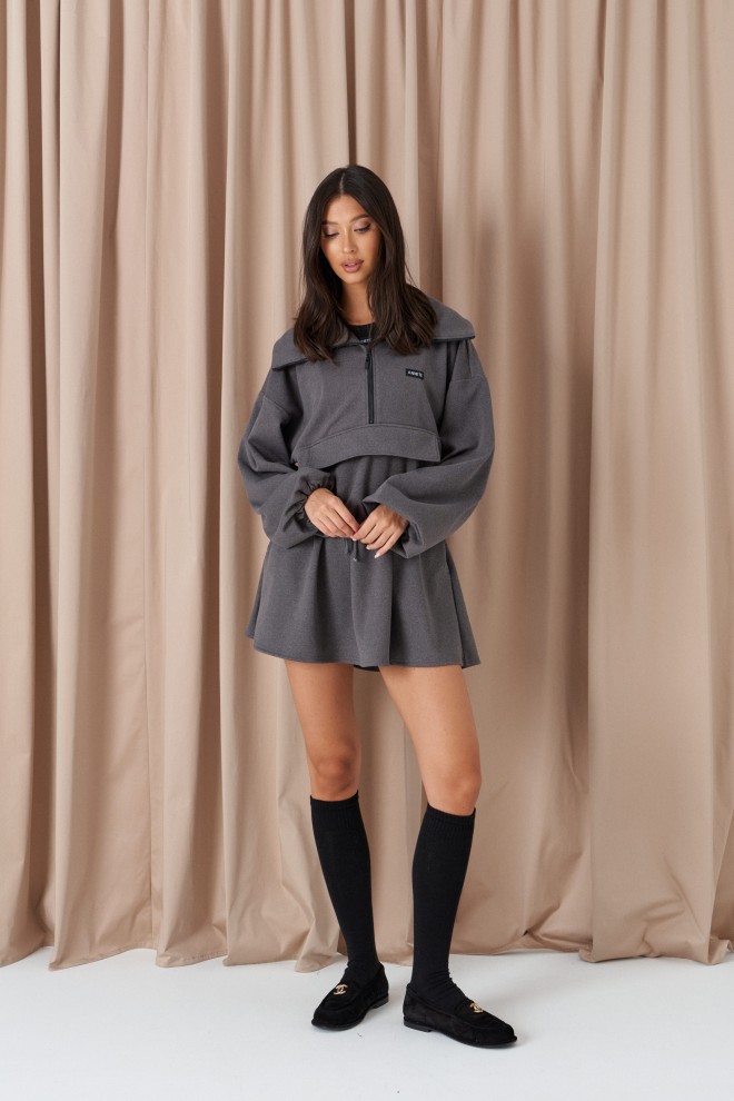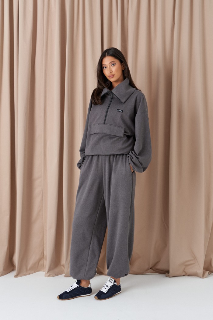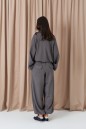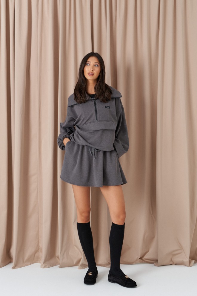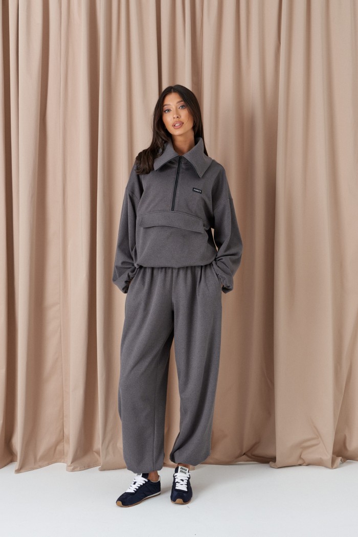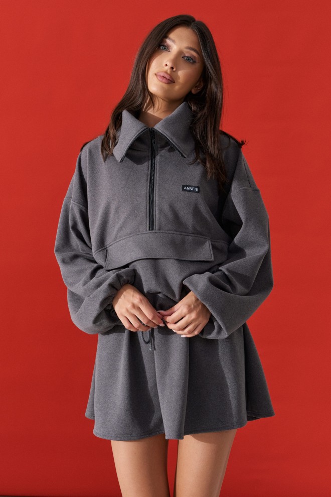 Джемпер прямого свободного кроя выполне из трикотажного полотна графитового цвета. Характеристики: прямой крой, широкий отложной воротник, застежка центральная -молния, спереди имитация кармана, рукав втачной спущенный, манжет на резинке, по низу изделие собирается на резинку с фиксаторами. Длина рукава от края горловины 80см, длина по спинке от края горловины 68см.