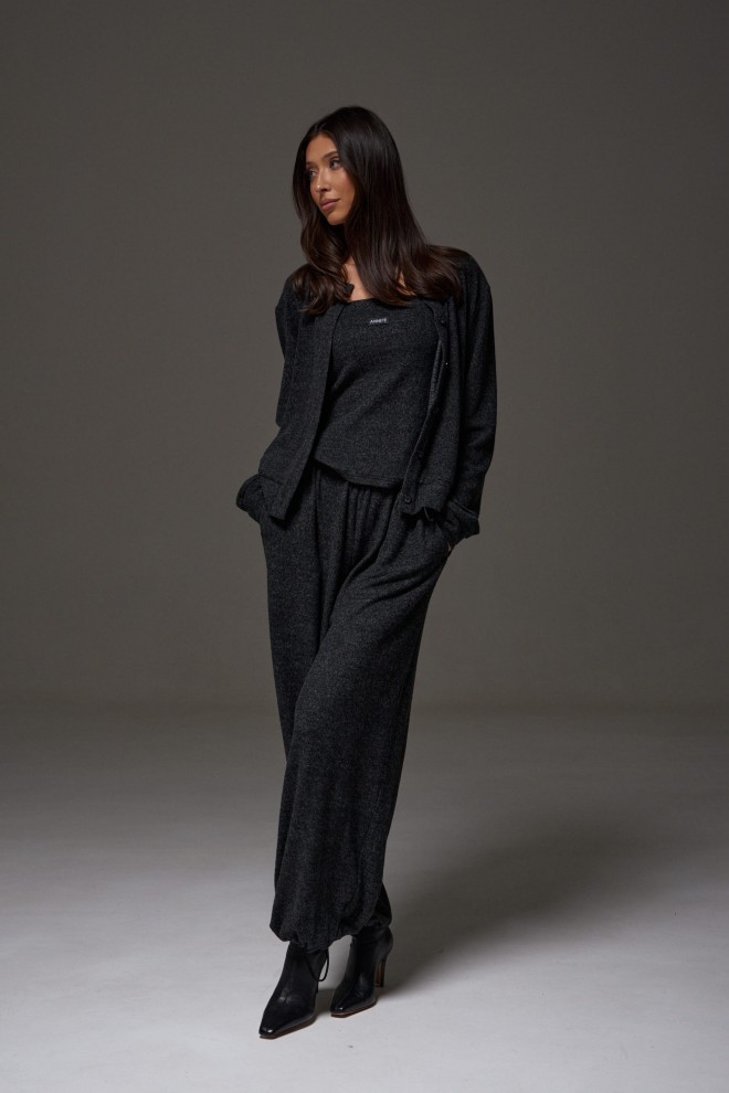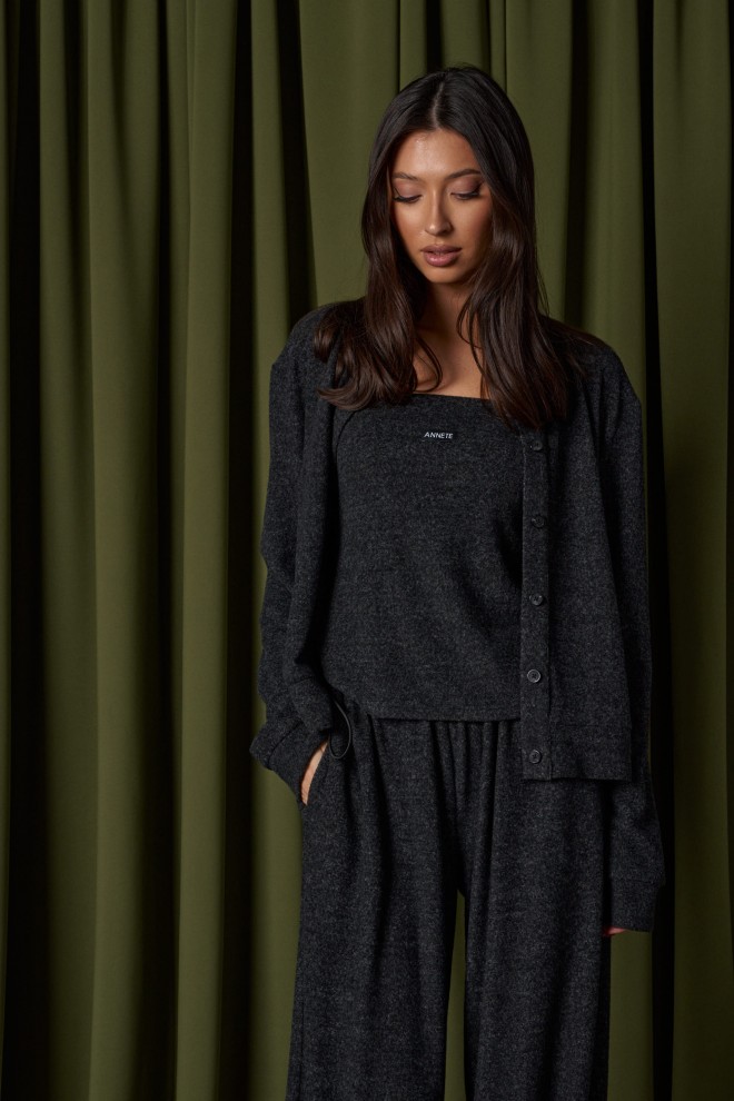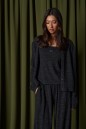 Джемпер прямого кроя, выполнен из трикотажного ворсистого полотна графитового цвета. Характеристика: прямой крой, воротник стойка, застежка центральная планка на петли-пуговицы, по низу планка чуть заужена, рукав втачной, манжет широкий. Длина рукава от края горловины 86 см, длина изделия по спинке 56 см.