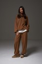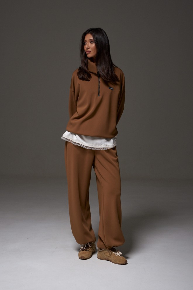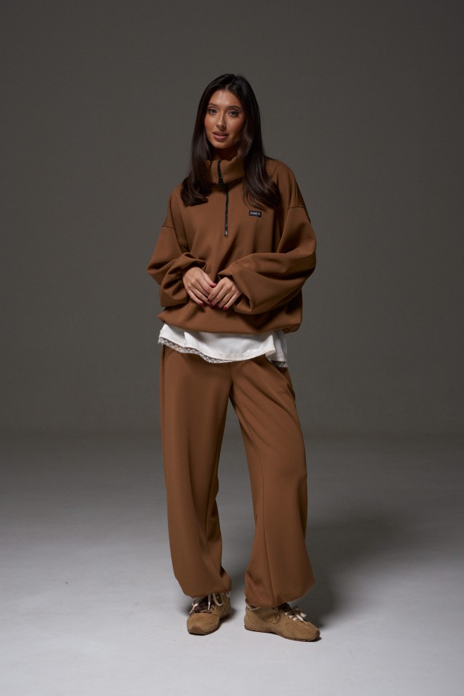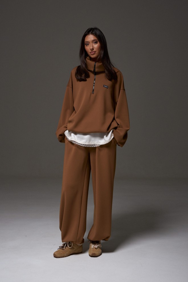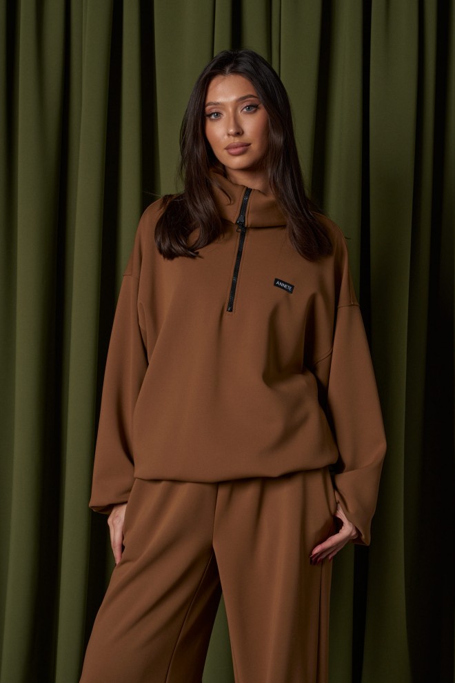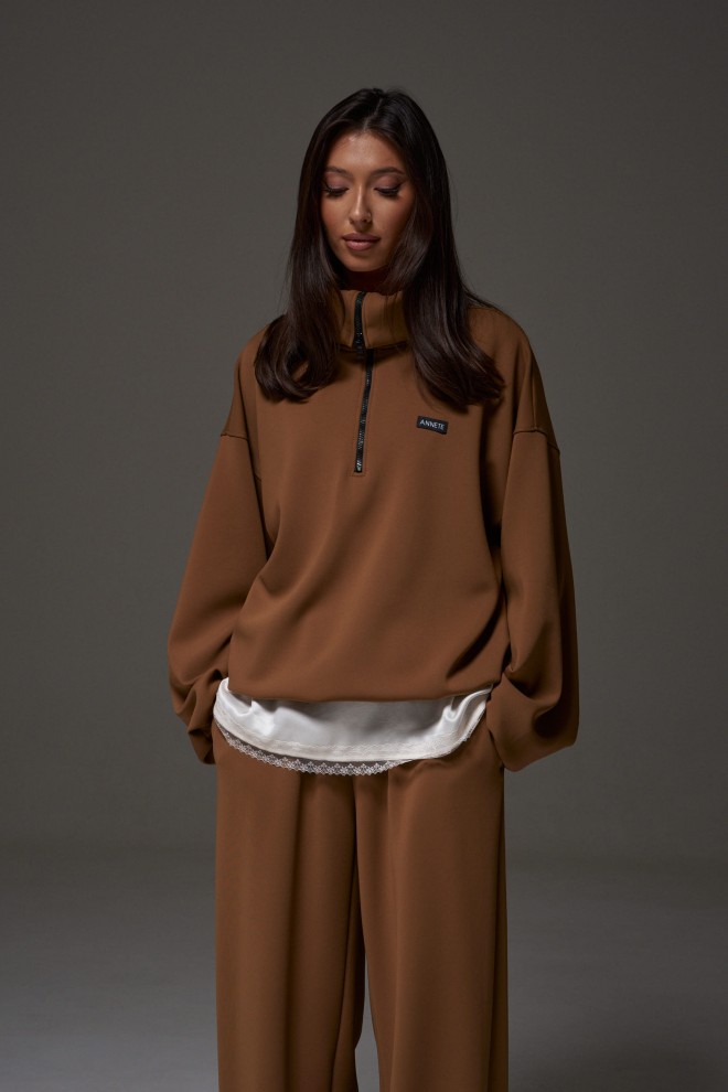 Джемпер прямого свободного кроя выполнен из трикотажного полотна кофейного цвета. Характеристики: прямой крой, широкий отложной воротник, центральная застежка-молния, рукав втачной спущенный, манжет на резинке с фиксаторами, по низу изделие собирается на резинку с фиксаторами. Длина рукава от края горловины 79 см, длина по спинке от шва горловины 71 см.