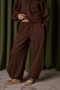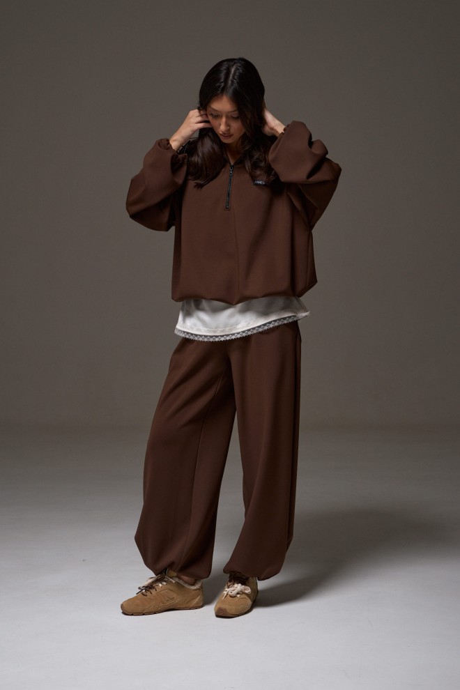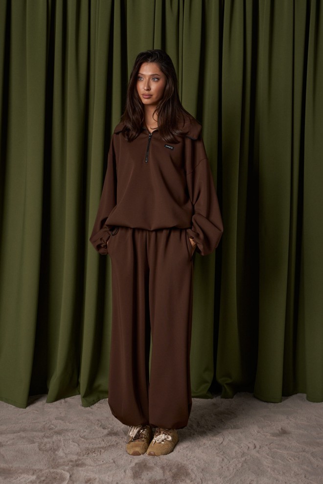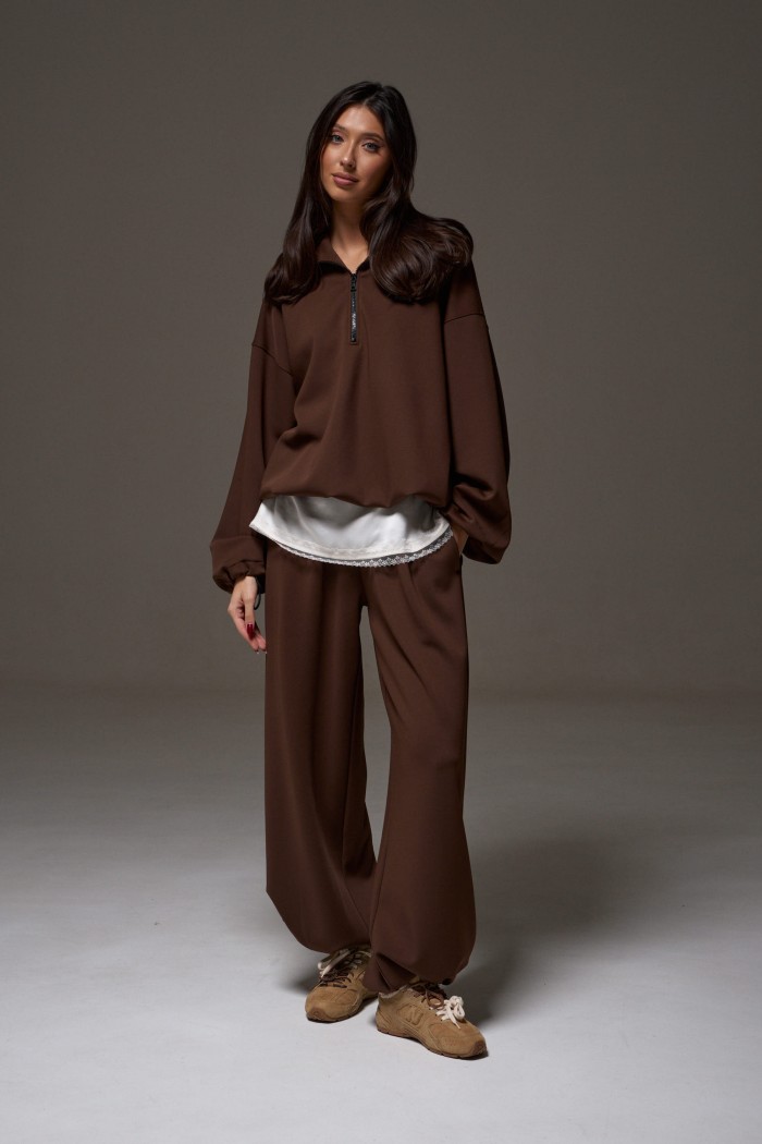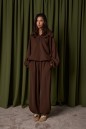 Джемпер прямого свободного кроя выполнен из трикотажного полотна шоколадного цвета. Характеристики: прямой крой, широкий отложной воротник, центральная застежка-молния, рукав втачной спущенный, манжет на резинке с фиксаторами, по низу изделие собирается на резинку с фиксаторами. Длина рукава от края горловины 79 см, длина по спинке от шва горловины 71 см.