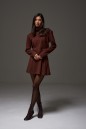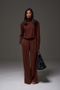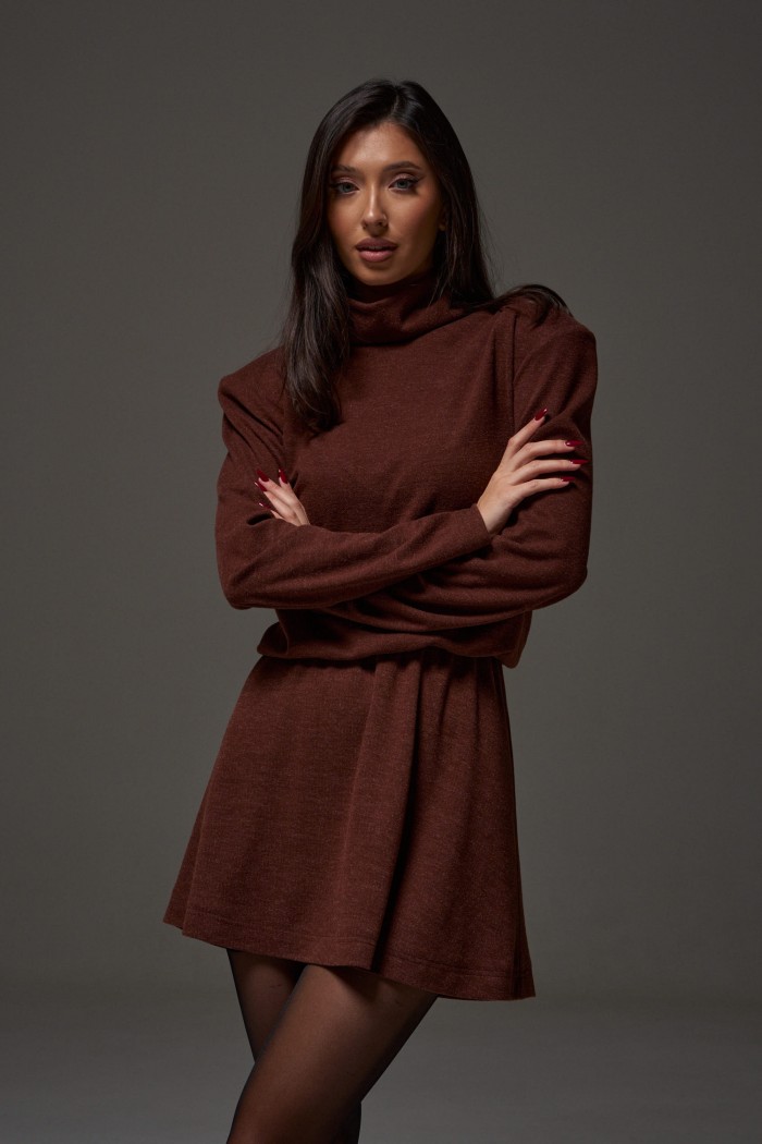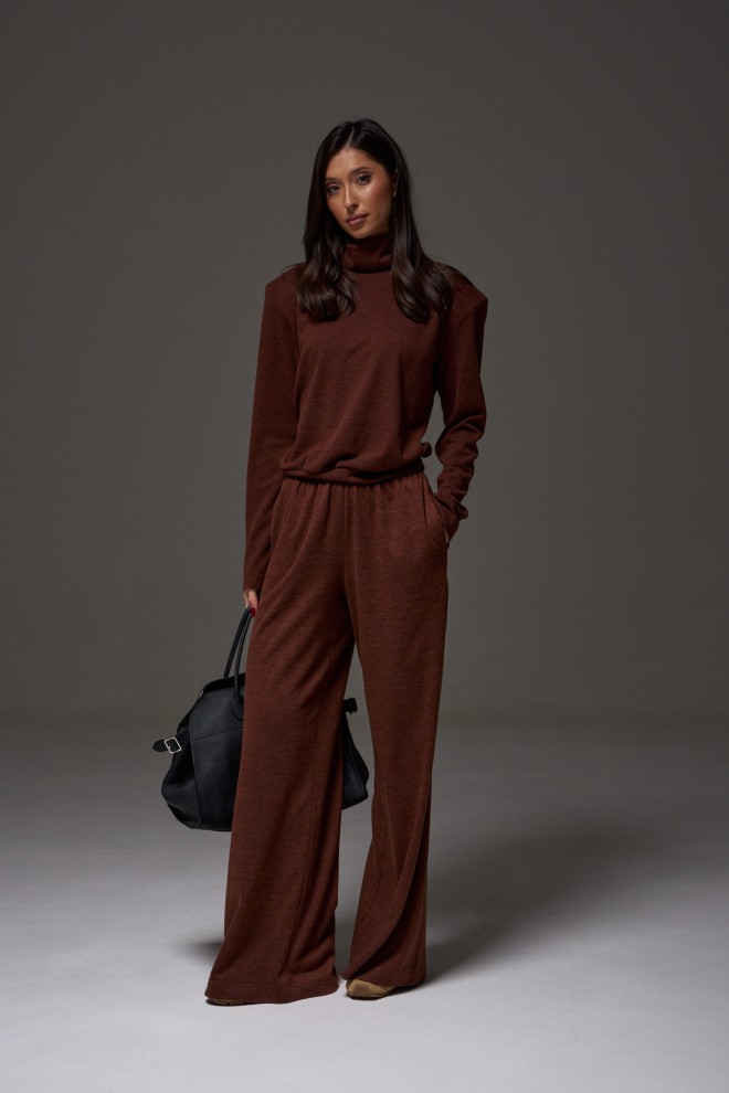 Джемпер прямого свободного кроя. Выполнен из мягкого трикотажа в шоколадном оттенке. Горловина-стойка, в естественную складку. Есть подплечники (съёмные). Длина рукава от линии втачивания 64 см, длина спинки 50 см.