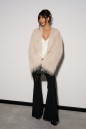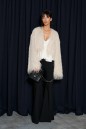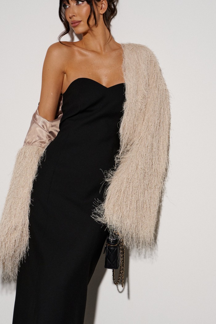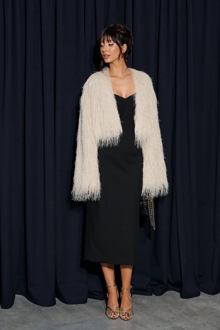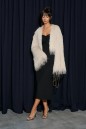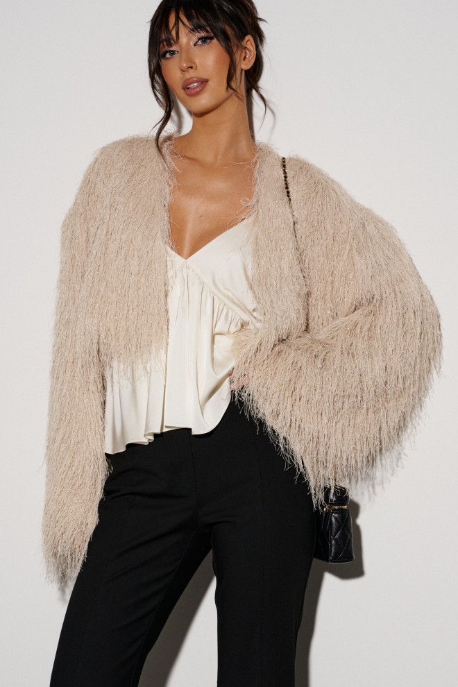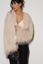 Укороченный кардиган, свободного кроя. Выполнен из полотна с длинным ворсом, кремового цвета с мелкими блестками. Характеристика: брендированная подкладка, рукав спущен. Длина по спинке 41см, длина рукава от края горловины 75см.
