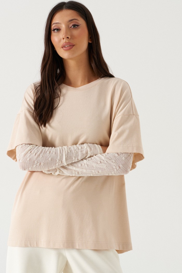 Футболка прямого свободного кроя с удлинённым рукавом. Выполнена из хлопковой ткани бежевого цвета. Вырез горловины круглый. Рукав втачной, спущенный. Изнутри втачан рукав из ажурной ткани. Длина рукава от линии втачивания 14,5 см, 51 см. Длина спинки 68 см