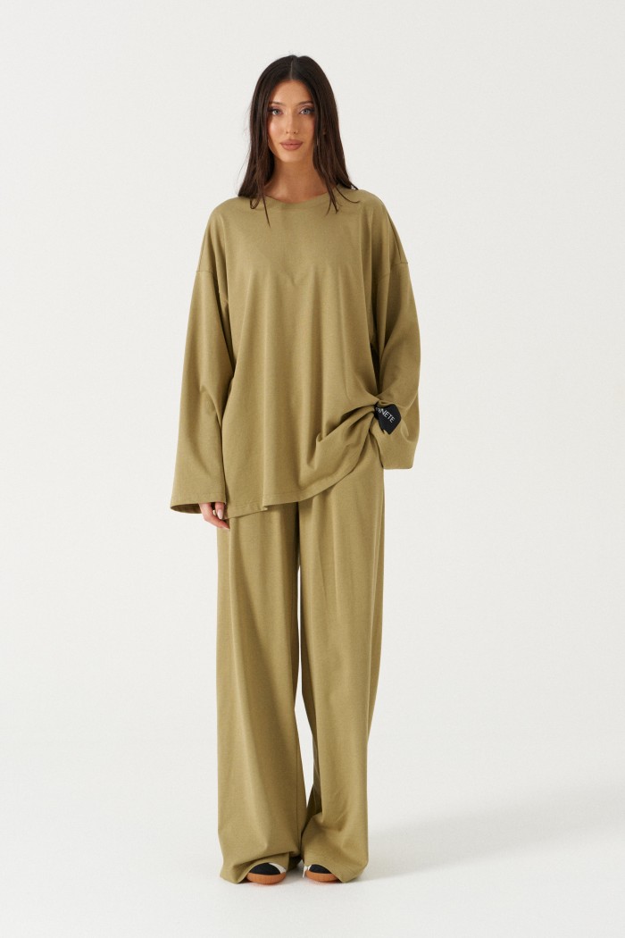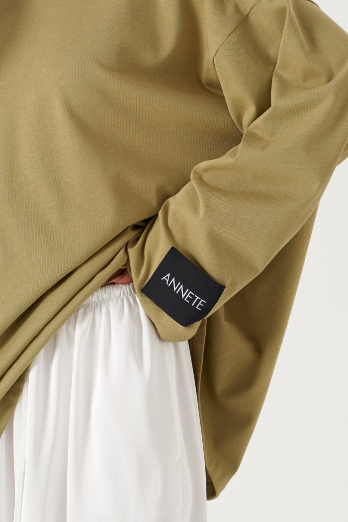 Джемпер прямого свободного кроя,выполнен из ткани шоколадного цвета. Характеристики: прямой крой, овальный вырез горловины, спинка цельнокроеная, спущенное плечо, рукав вточной широкий, на левом рукаве брендированная нашивка "Annete". Длина изделия по центру по спинки 75 см, длина рукава от края горловины 70см.