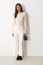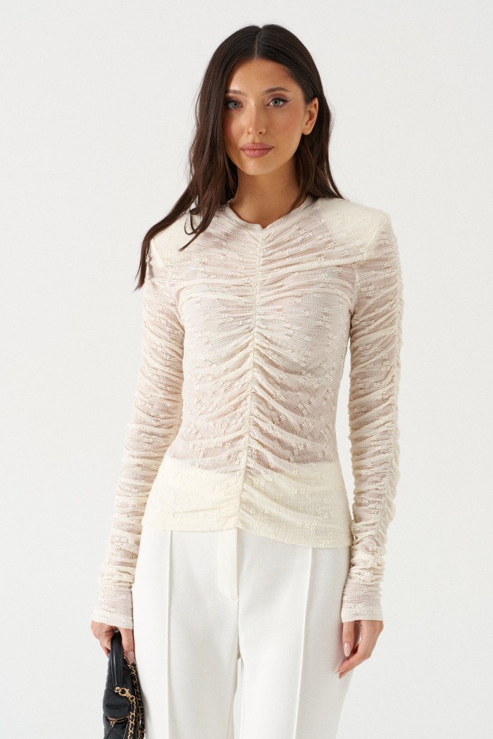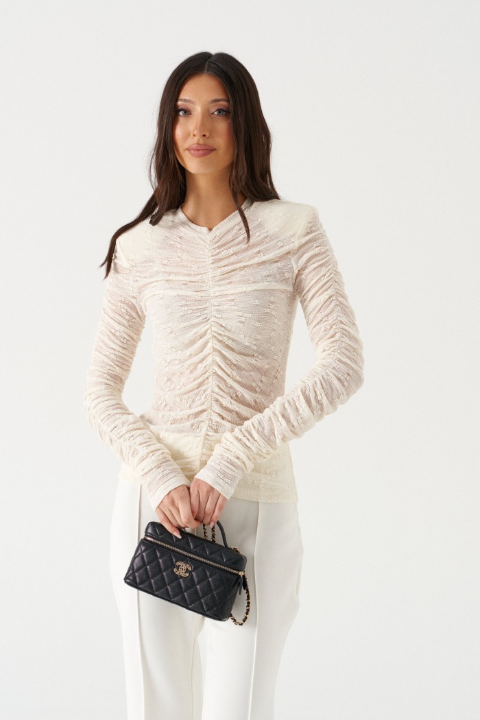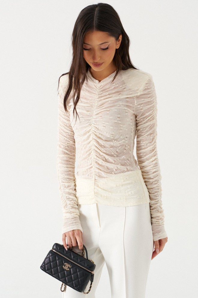 Джемпер женский облегающего силуэта, выполнен из кружевного полотна молочного цвета. Характеристика: облегающий силуэт, оавальный вырез, спереди и по спинке центральныйу шов выполнен зборкой, пришиты плечики, рукав втачной, внутренний и внешний швы выполнены сборкой, без подклада. Длина рукава от края горловины 84см, длина изделия по центру спинки 58см.