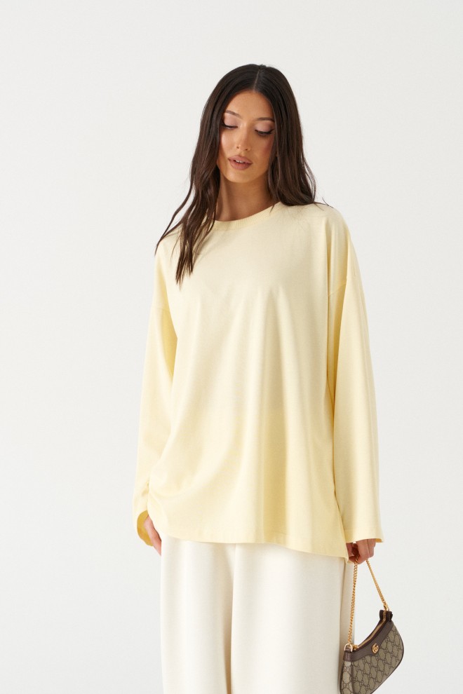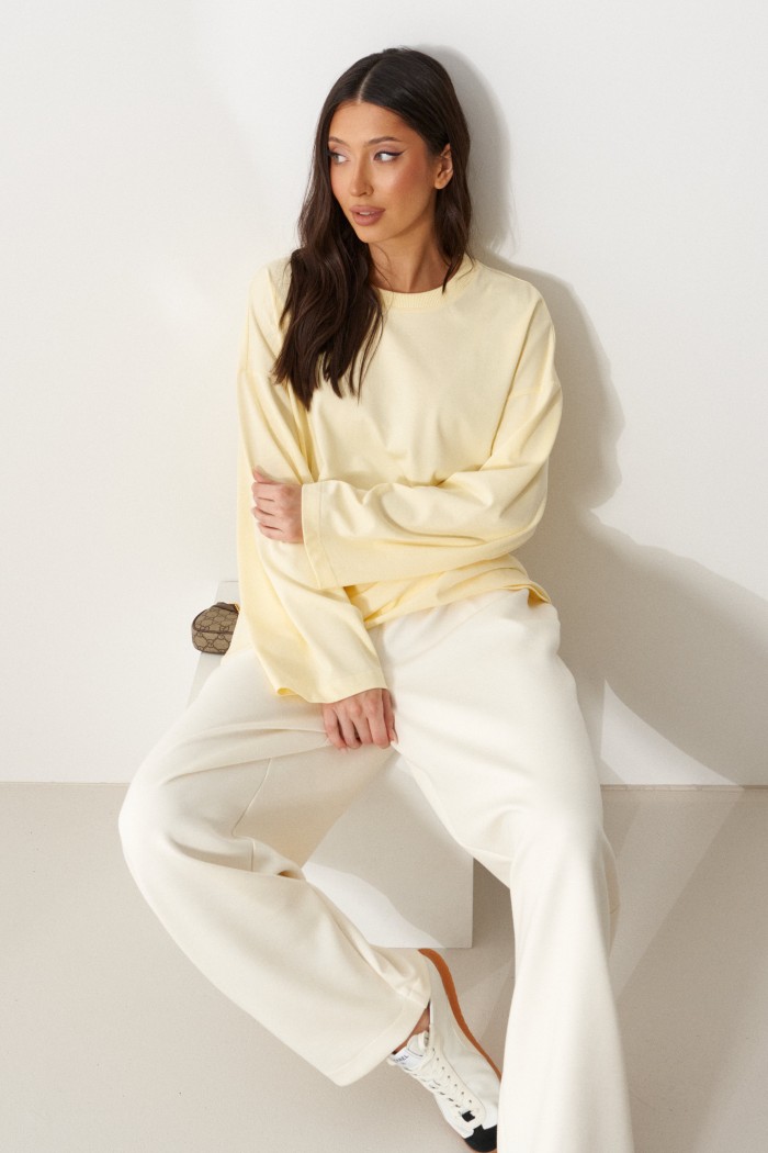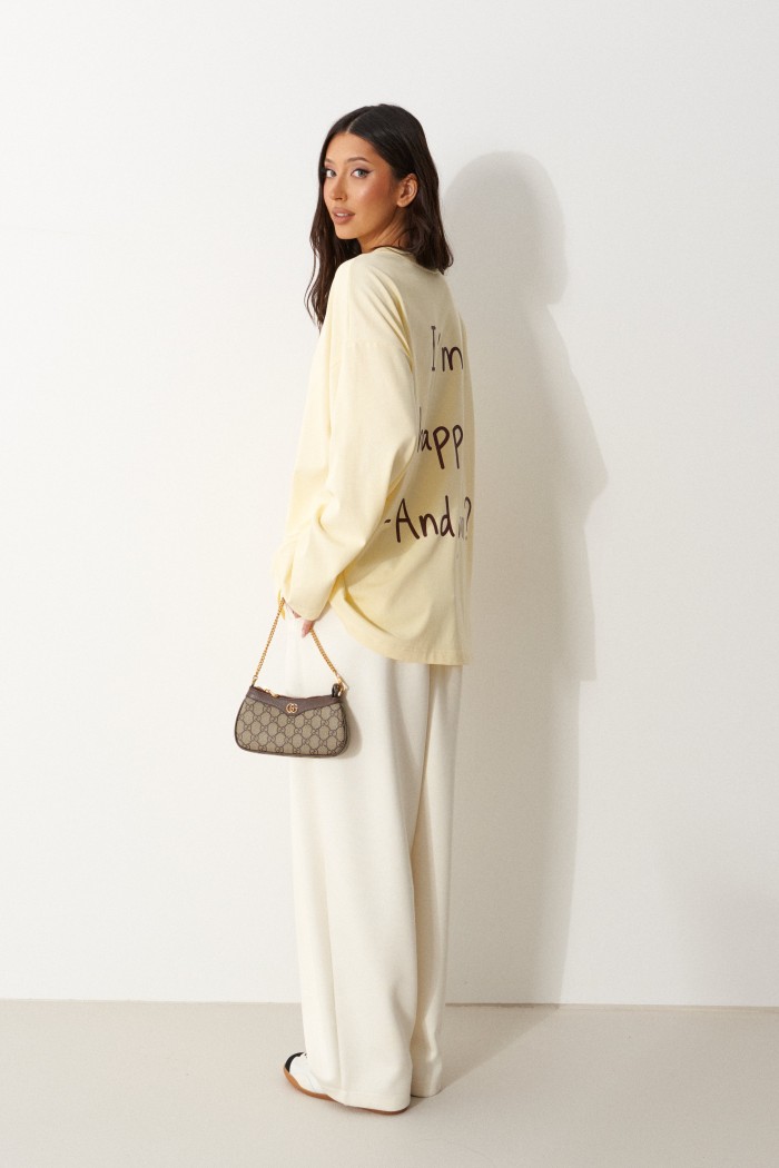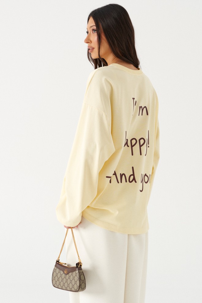 Джемпер прямого свободного кроя,выполнен из трикотажного полотна лимонного цвета. Характеристики: прямой крой, овальный вырез горловины, горловины из довяза, спинка цельнокроеная, Принт "I'm happy! And you?", спущенное плечо, вточной длинный рукав. Длина по центру спинки 70 см, длина рукава от края горловины 76см.