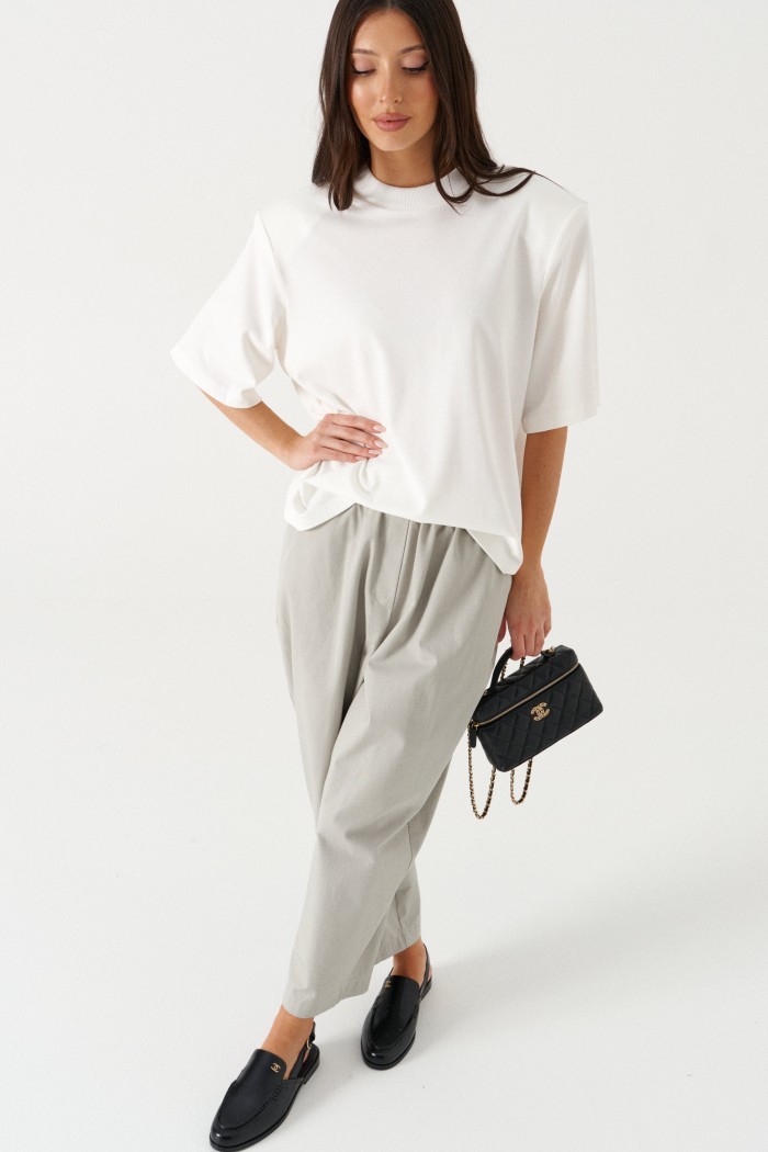 Футболка прямого силуэта. Выполнен из хлопкового полотна белого цвета. Характеристика: вырез горловины круглый с притачной планкой-резинкой. Рукав одношовный, втачной, короткий. Подплечники. Длина по спинке 59 см, длина рукава от горловины 29 см.