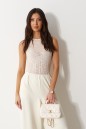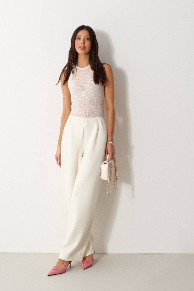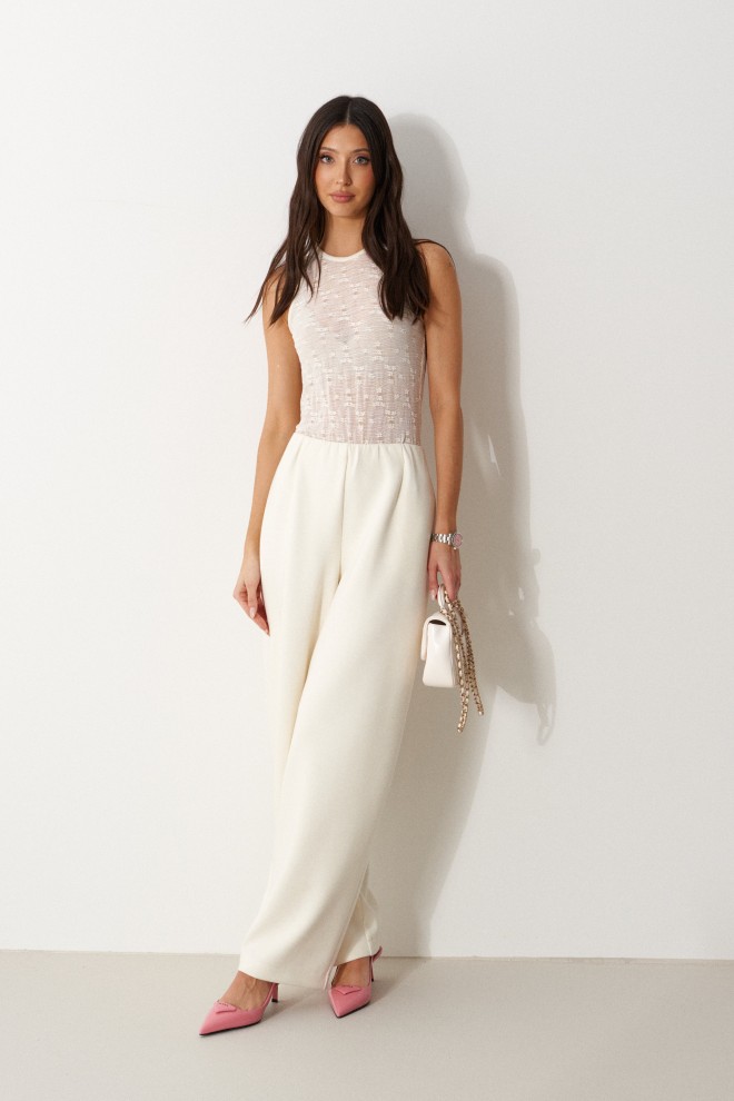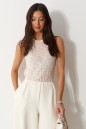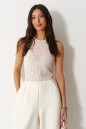 Боди приталенного силуэта выполнено из из кружевного полотна молочного цвета. Характеристика: облегающий силуэт, оавальный вырез, без подклада. Длина по боковому шву 35см.