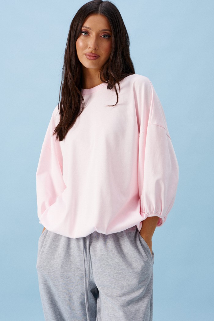 Джемпер свободного кроя, выполнен из хлопкового полотна розового цвета. Характерисика: свободный крой, овальная горловины из довяза, низ изделия на резинке, плечо спущено, рукав втачной, край на резинке. Длина рукава открая горловины 58см. Длина изделия по центру спинки от края горловины 65,5см.