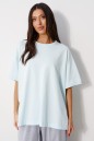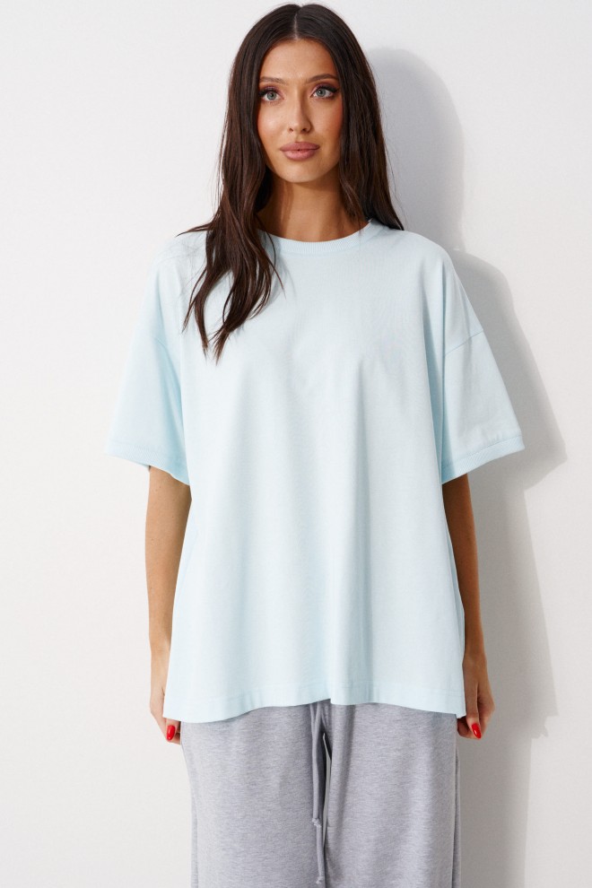 Футболка прямого свободного кроя, выполнена из трикотажного полотна голубого цвета. Характеристика: прямой крой, овальная горловина выполнена из довяза, рукав вточной спущенный, край выполнен из довяза, спинка цельнокраеная, на спинке под горловиной брендированная нашивка "ANNETE". Длина по спинке 68см, длина рукава от края горловины 40см.