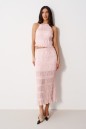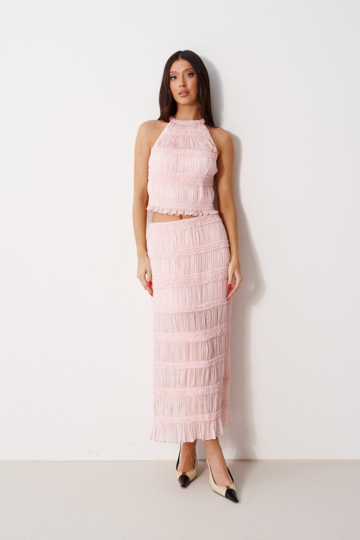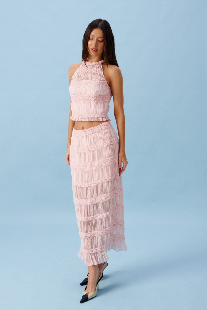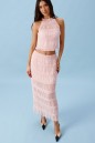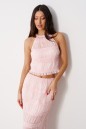 Топ полуприлегающего силуэта. Выполнен из прозрачной фактурной ткани нежно-розового цвета. По переду с подкладкой. Застежки в изделии нет. Длина спинки 44 см