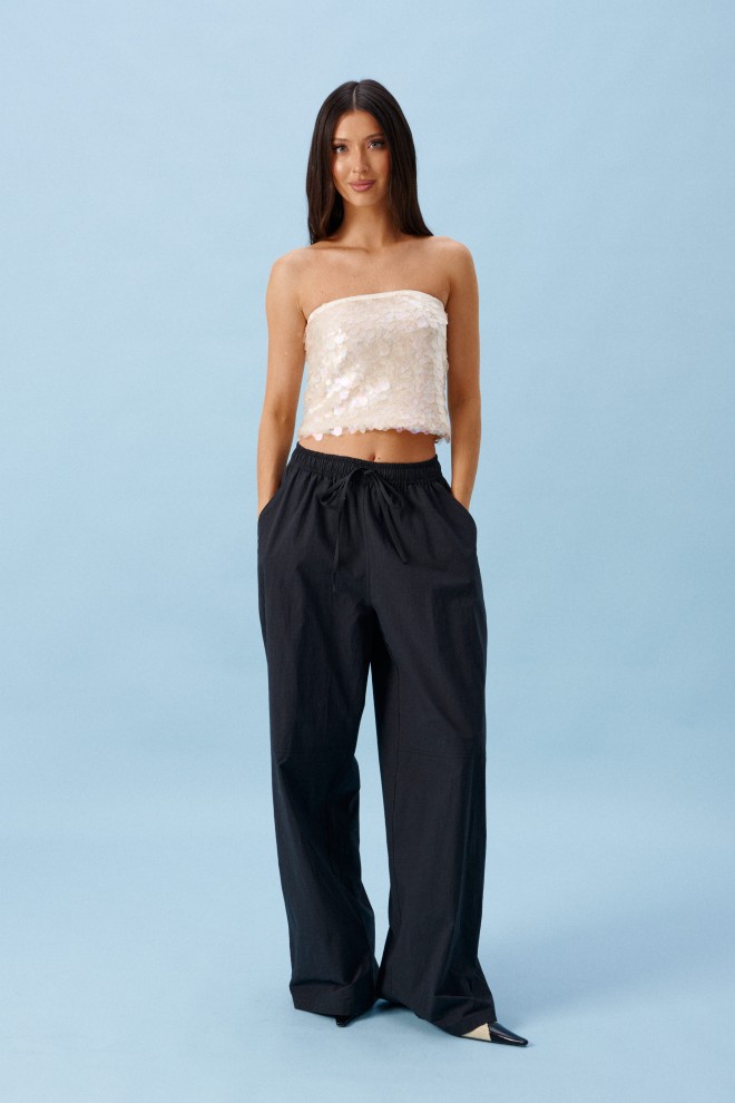Топ свободного кроя. Выполнен из ткани с пайетками. С подкладкой. Верх на резинке. Длина 24 см