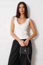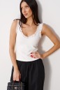 Топ прилегающего силуэта. Выполнен из мягкой трикотажной ткани тёплого белого цвета. Вырез горловины V-образный. По линии выреза горловины и по спинке кружево, переходящее в бретели. Длина спинки 35 см