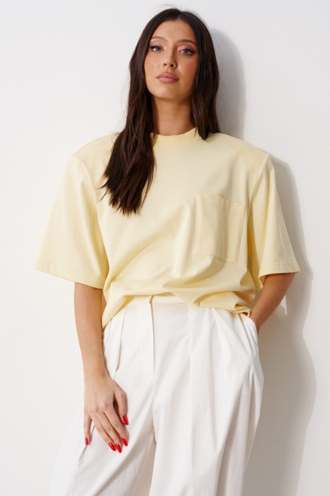 Футболка прямого кроя, выполнена из хлопкового полотна. Характеристика: прямой свободный крой, горловина овальная, рукав втачной, подплечники съёмные, . Длина по центру спинки от края горловины 63 см, длина рукава 28 см.