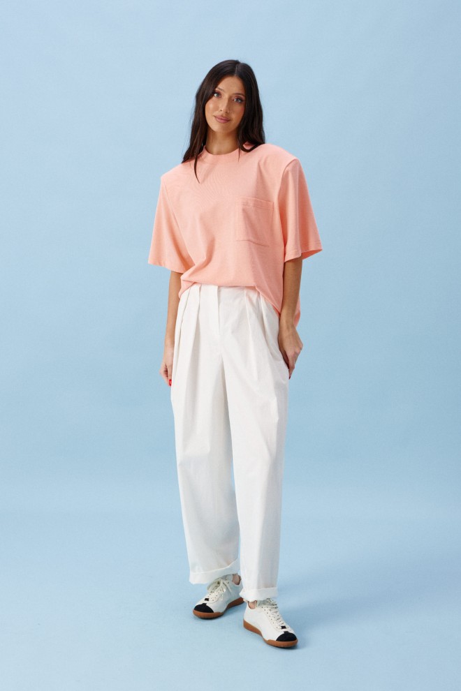 Футболка прямого кроя, выполнена из хлопкового полотна. Характеристика: прямой свободный крой, горловина овальная, рукав втачной, подплечники съёмные, . Длина по центру спинки от края горловины 63 см, длина рукава 28 см.