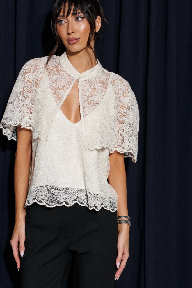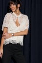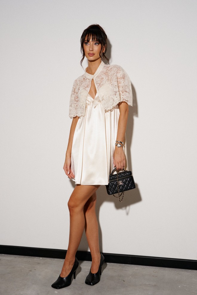 Кейп выполнен из кружевного сатинового полотна молочного цвета. Характеристики: горловина стойка, застежка центральная на пуговицу. Длина по спинке 36см.