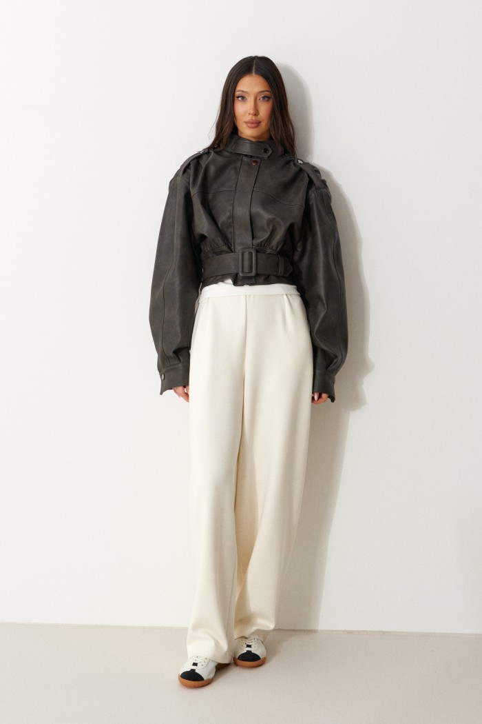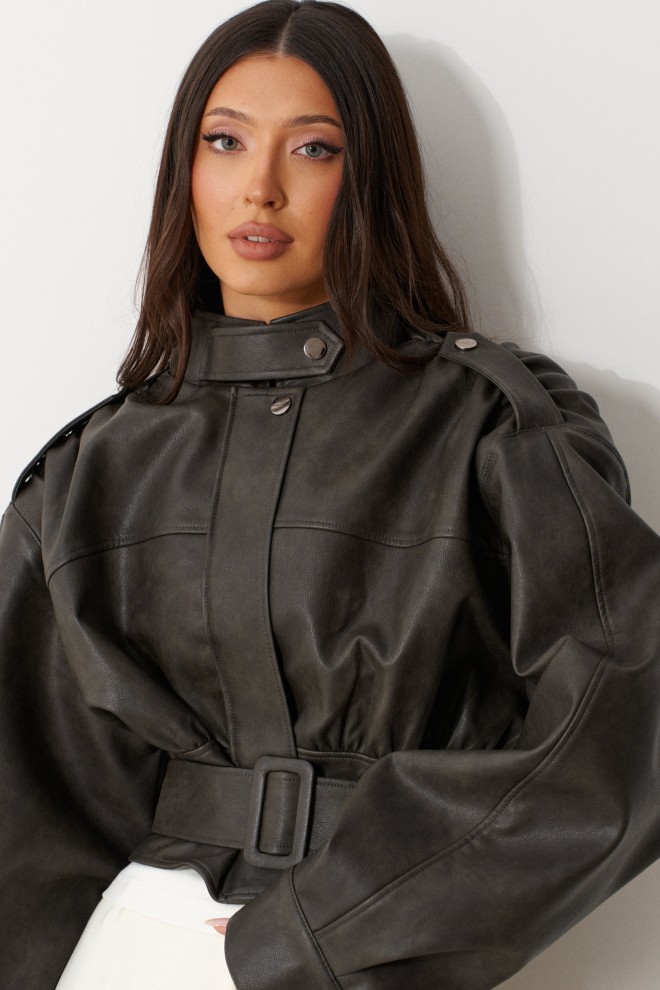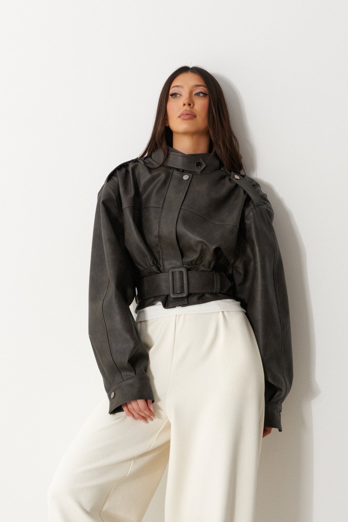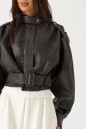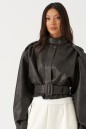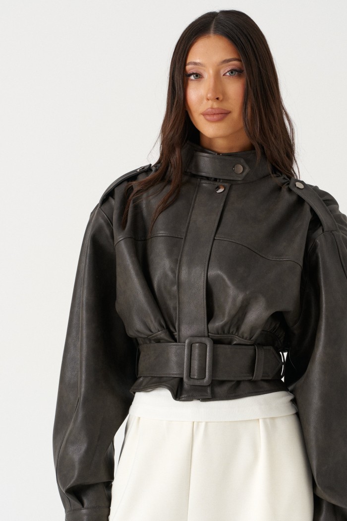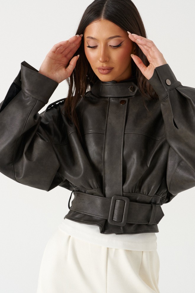 Куртка с акцентыми деталями, выполнен из эко-кожи графитового цвета. Характеристика: укороченный крой, воротник-стойка с застежкой-ремешком на кнопке, центральная застежка-замок, скрытая под планкой на кнопку сверху, плечевые швы сшиты сборкой и гармонично сочетаются с патами на кнопке, плечики, брендированный подклад, планка по низу изделия спереди, спинка отрезная, по спинке талия на резинке с кокеткой по низу, пояс в комплекте, рукав втачной слегка спущен, широкий манжет на одну кнопку. Длина рукава от края горловины 81см. Длина изделия по центру спинки 53см.