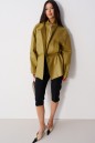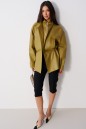 Куртка свободного кроя. Выполнена из эко-кожи оливкового цвета. С подкладкой. Воротник-стойка. Рукав реглан, с манжетом. Внутренняя часть изделия - манишка с центральной застёжкой - молнией. Основная часть изделия с прорезными карманами с листочкой. По линии талии - резинка, с кулиской, с фиксаторами. Длина рукава от горловины 79 см. Длина спинки 73 см