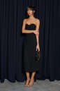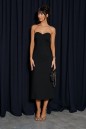 Платье-миди, выполнено из черного текстильного полотна. Характеристики: прилегающий силуэт, верх фигурный, имитация корсета,в среднем шве заднего полотна застёжка - потайная тесьма-молния, подкладка, по задней части шлица 45 см. Длина спинки 99 см